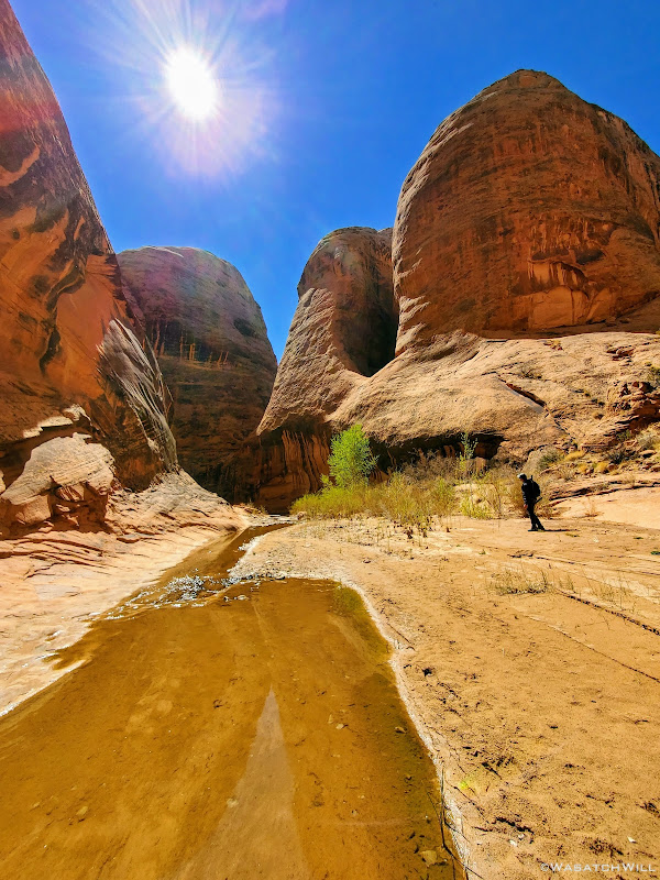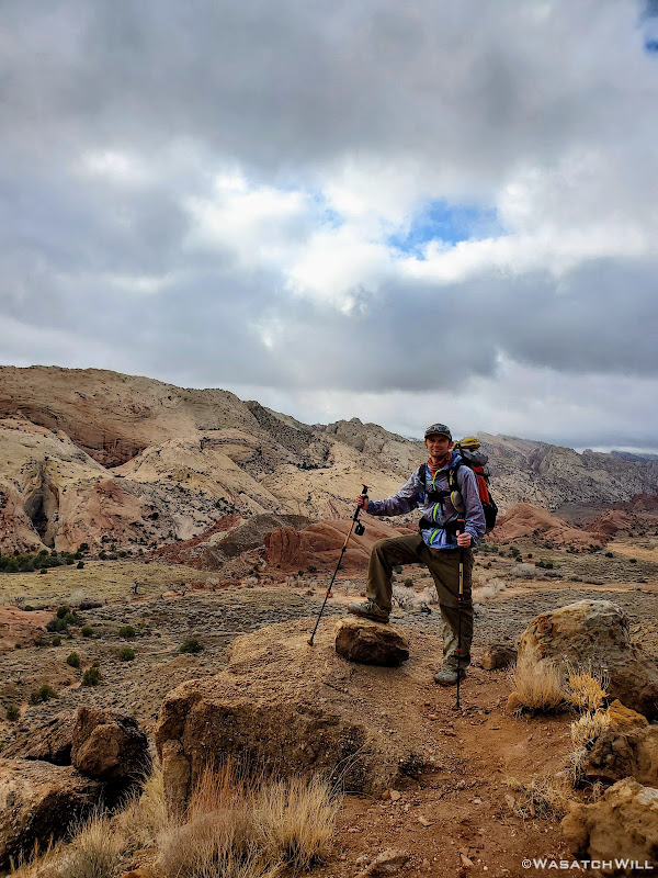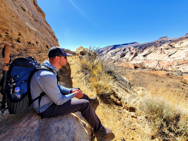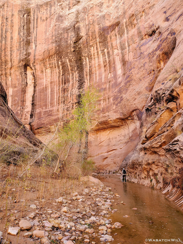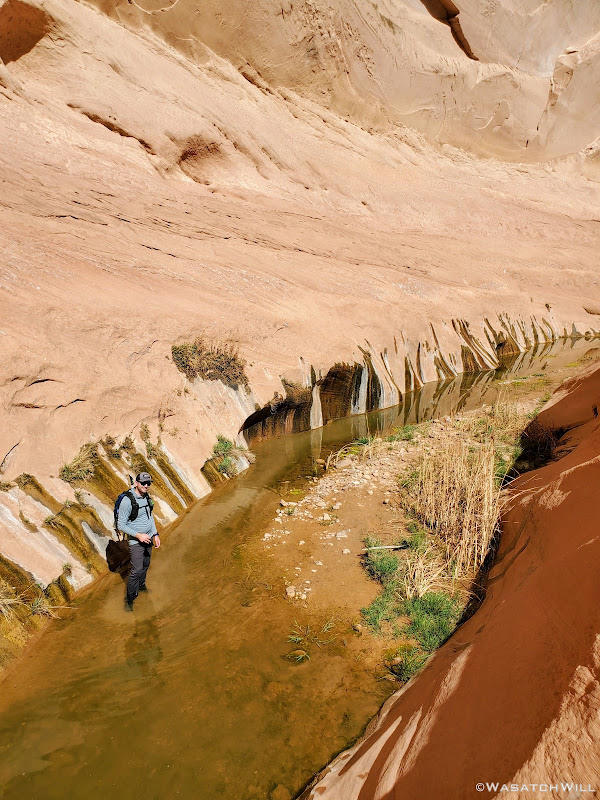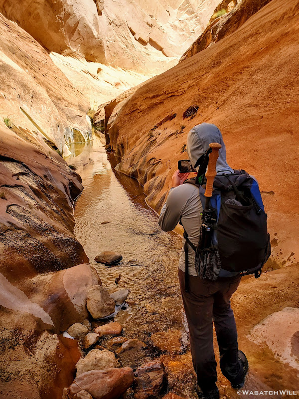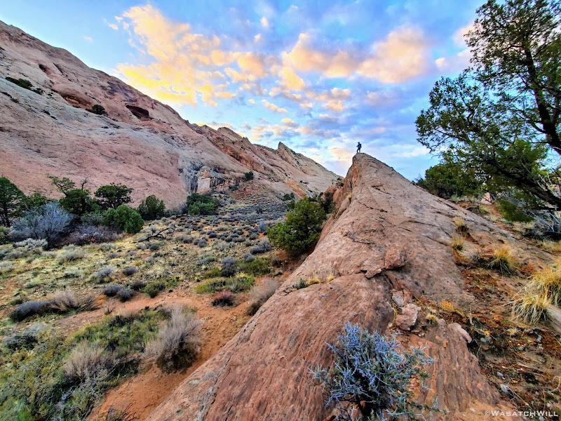 About halfway down the wash, we began to look around for a suitable campsite. To aid our search, Devin had walked up a little sandstone fin to get a better view. When I turned back to see him, a fantastic photo opportunity had presented itself.