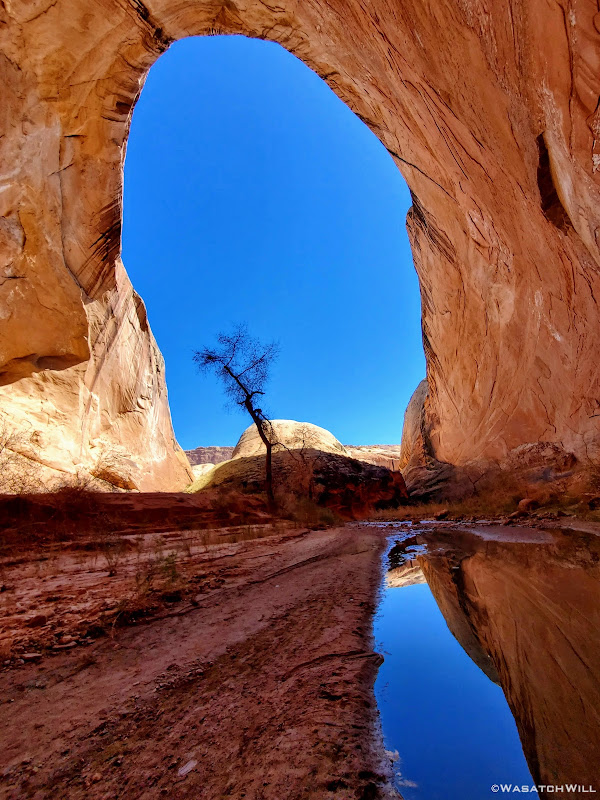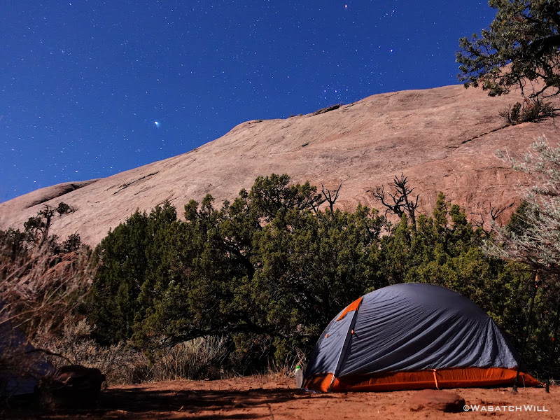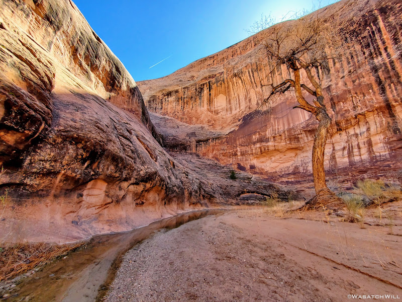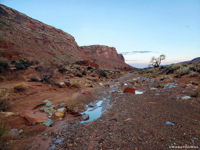 We ended up traveling nearly another mile down canyon before settling into a virtually perfect little spot, with fresh water from the recent storm close by and trees to shield any winds.