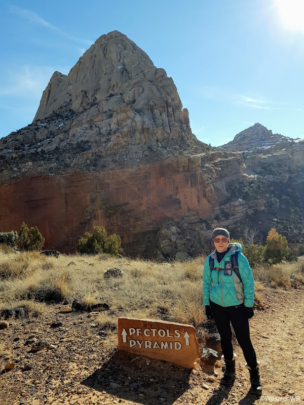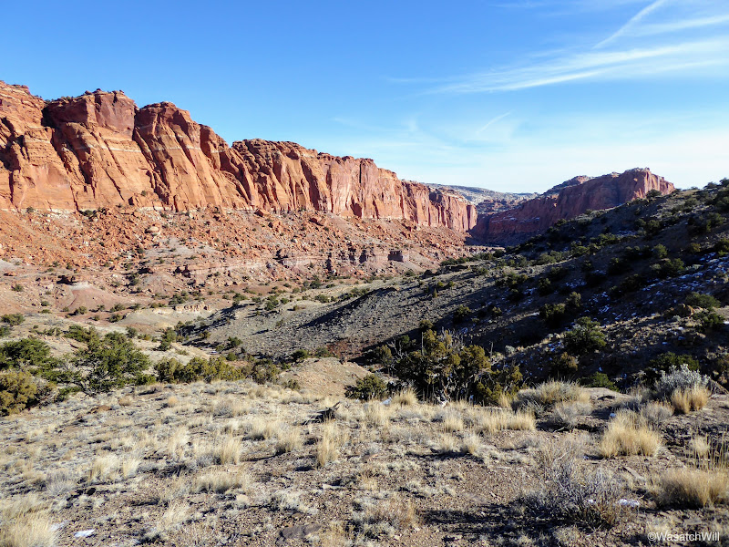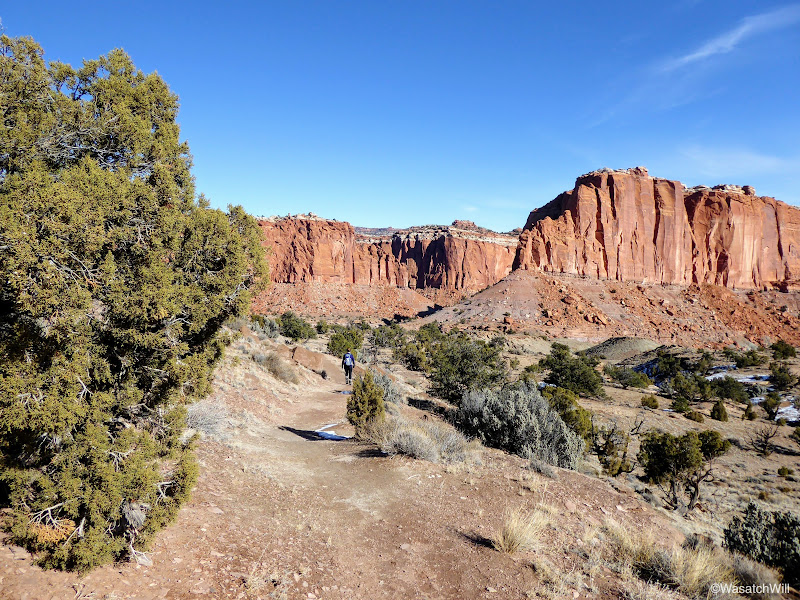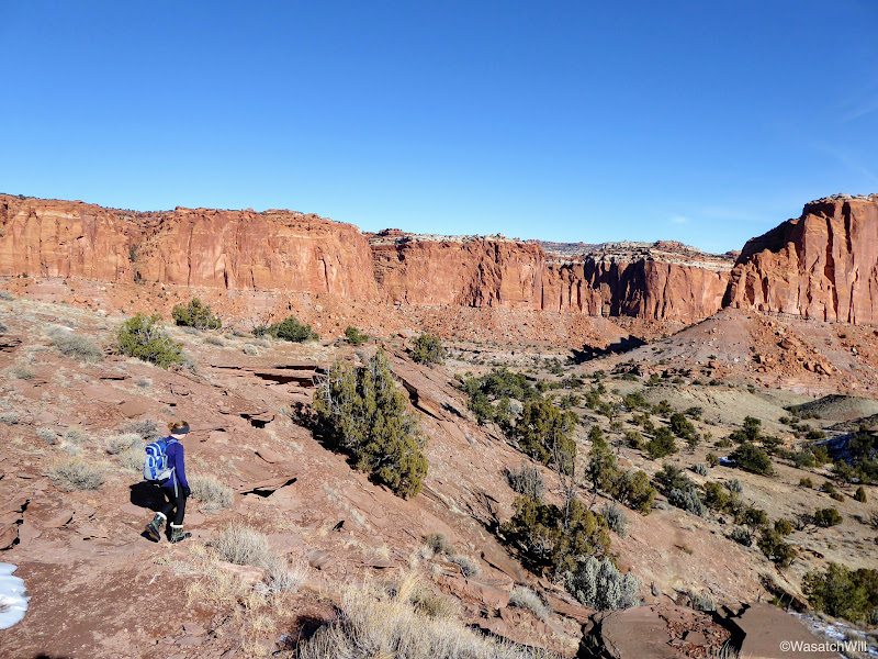 We set off just after breakfast and drove down the road from Torrey down to the Chimney Rock trailhead in the Park. This hike would mark my third time using this trailhead. The first was a solo backpacking trip I did through Capitol Reef a couple years ago and the second was a hike up into Chimney Canyon and down Spring Canyon with Jessica last year. For both of us, this would be the first time we'd hike the Chimney Rock Trail Loop full circle. Weather was cold and breezy but not unbearable starting out. Once we got going, we quickly began to warm up.