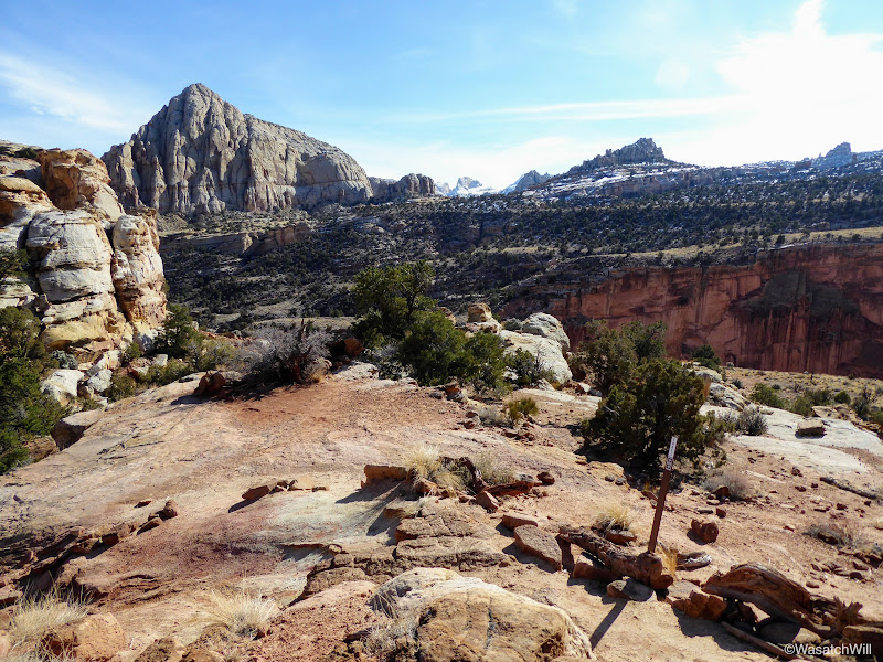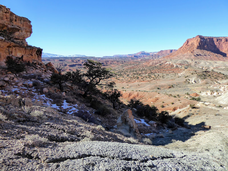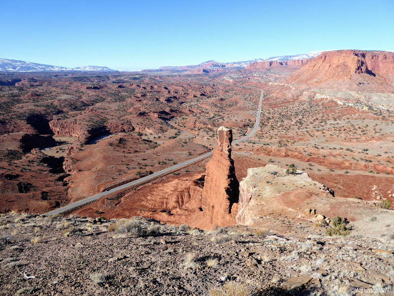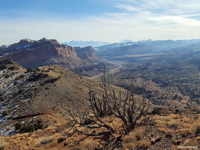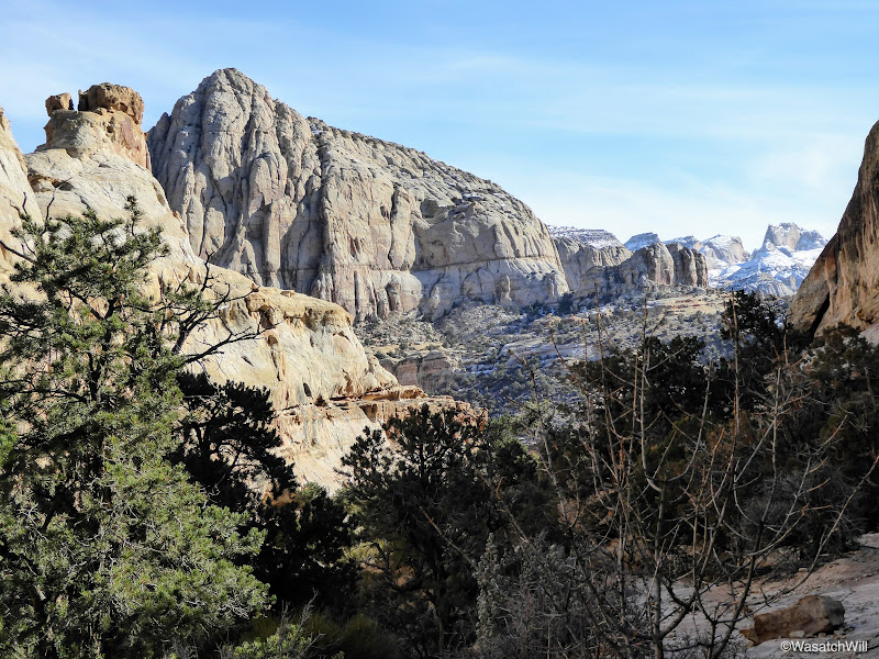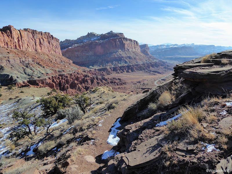 The views to the south were neat in being able to see some snow still lingering on the north facing buttes and pinnacles, including Fern's Nipple, rising from the Waterpocket Fold that makes up most of Capitol Reef's geology.