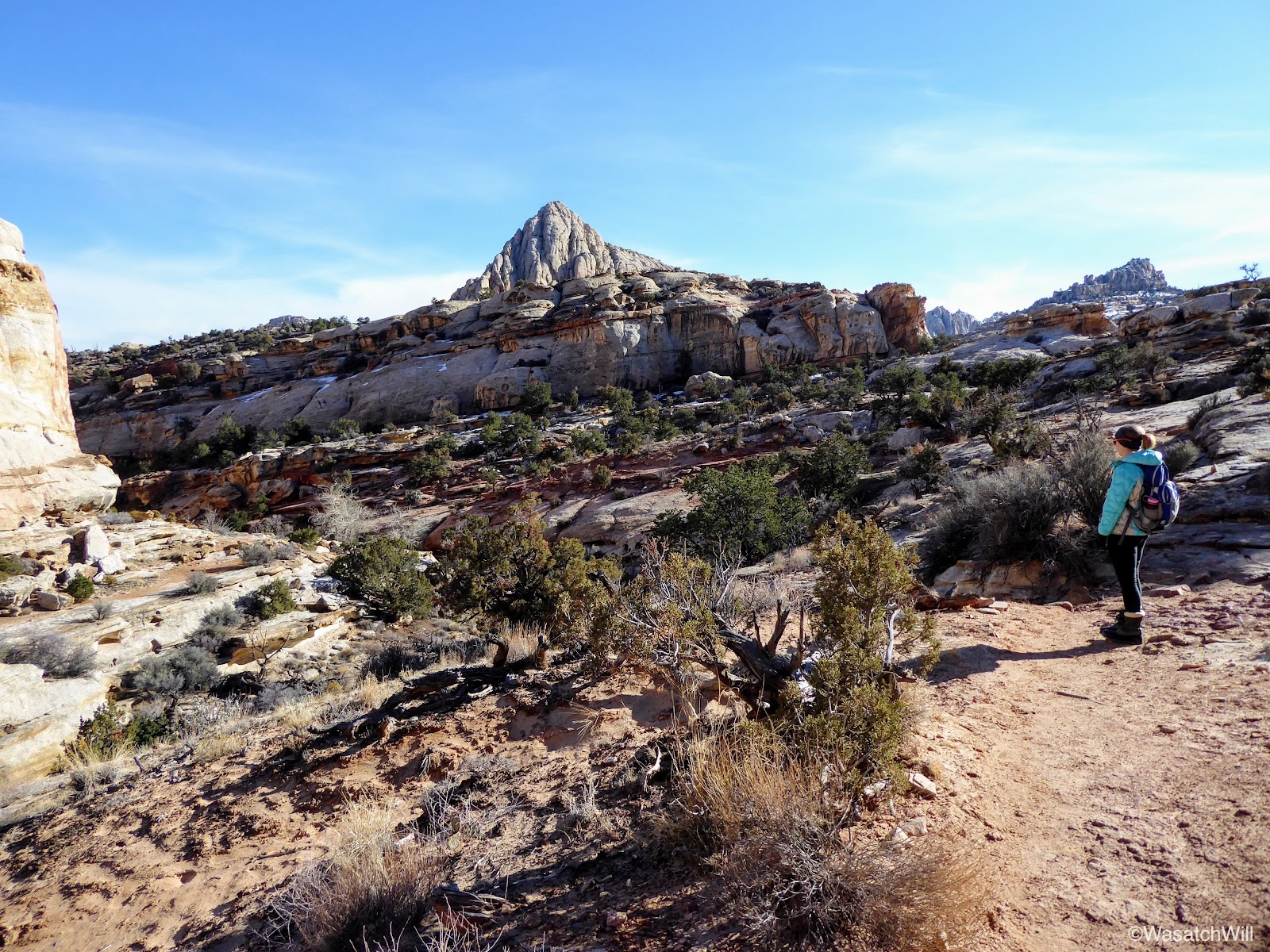 We set off just after breakfast and drove down the road from Torrey down to the Chimney Rock trailhead in the Park. This hike would mark my third time using this trailhead. The first was a solo backpacking trip I did through Capitol Reef a couple years ago and the second was a hike up into Chimney Canyon and down Spring Canyon with Jessica last year. For both of us, this would be the first time we'd hike the Chimney Rock Trail Loop full circle. Weather was cold and breezy but not unbearable starting out. Once we got going, we quickly began to warm up.