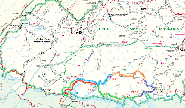Lakeshore Trail => Bear Creek Trail => High Rocks => Cold Spring Gap Trail => Hazel Creek Trail => Lakeshore Trail