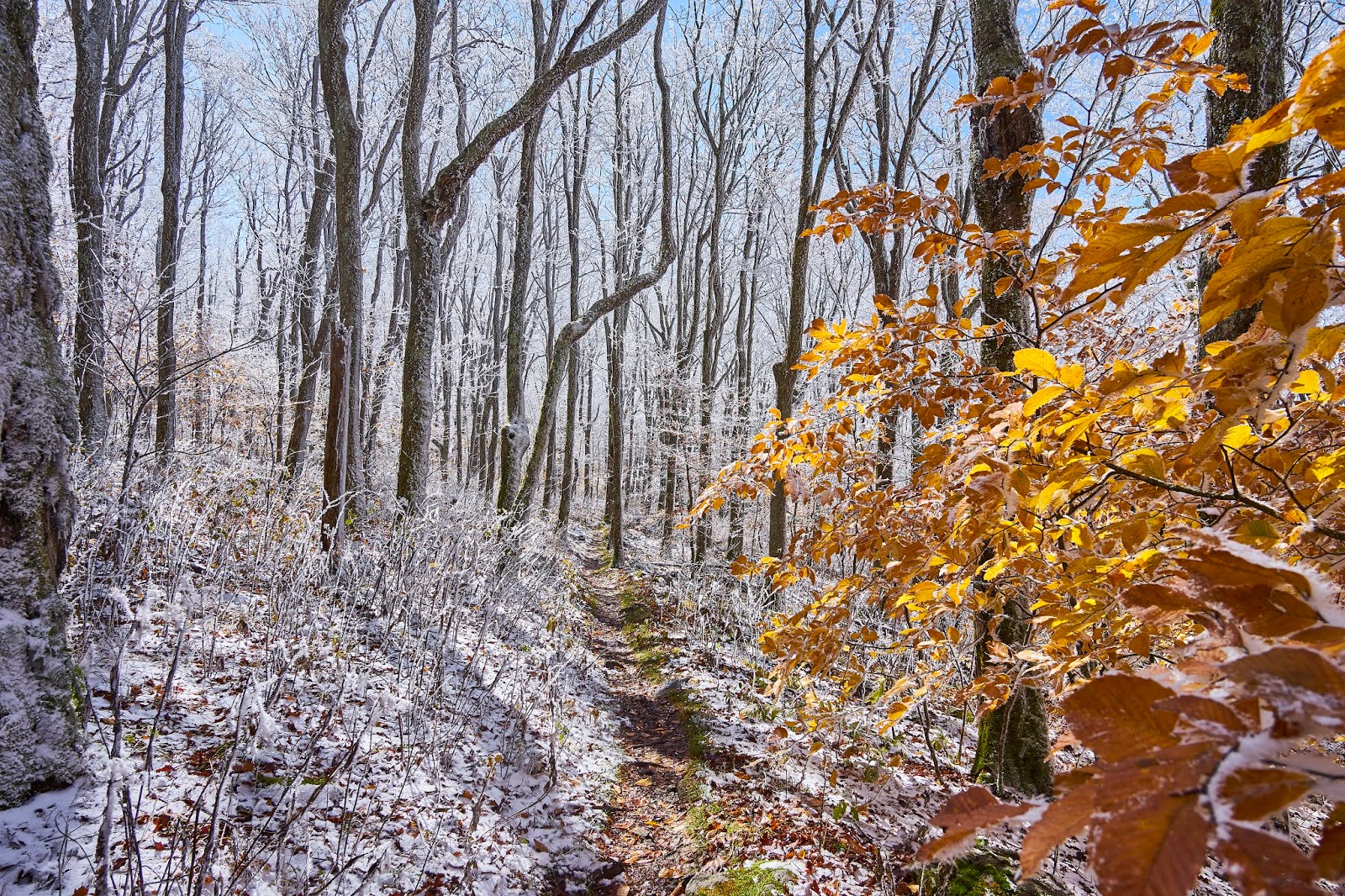 I dropped the kids off at school and headed to SW Virginia and the Elk Garden Trailhead. After a 5 hour drive I saw something like below. You can see the trailhead/road in in the middle. Evidently the rainy weather that blew through KY also went through VA. It was interesting driving up to the trailhead because there was a very distinct freeze line in the trees. At the trailhead, all the trees were covered in blown snow, very pretty. The thermometer in my car said 36 degrees.