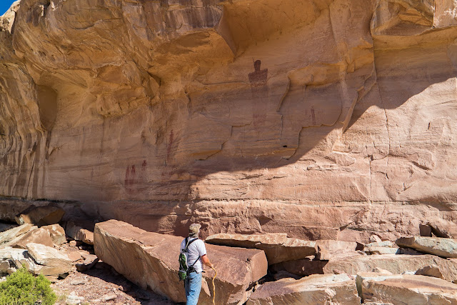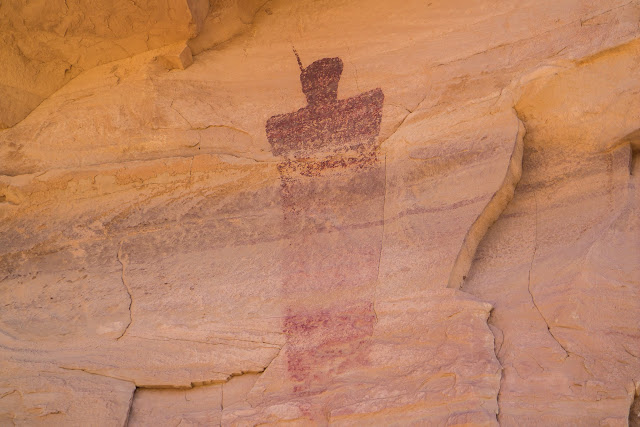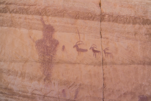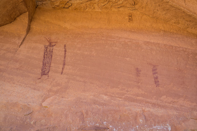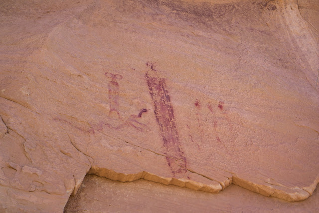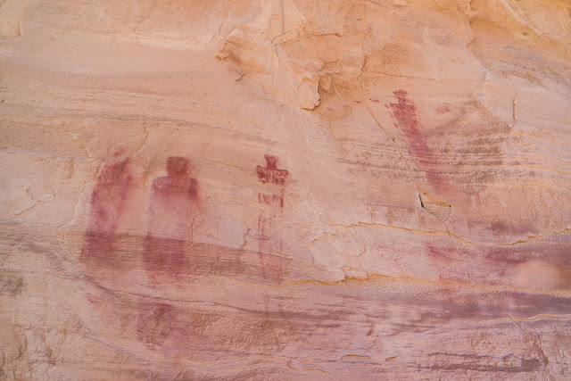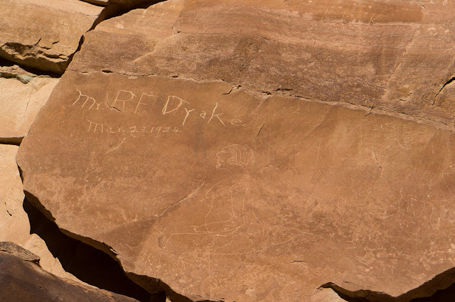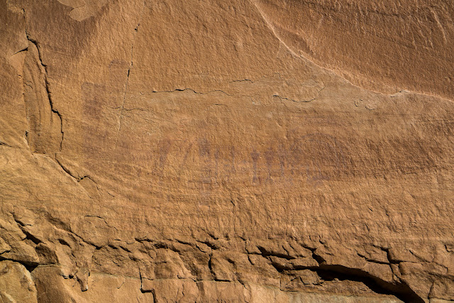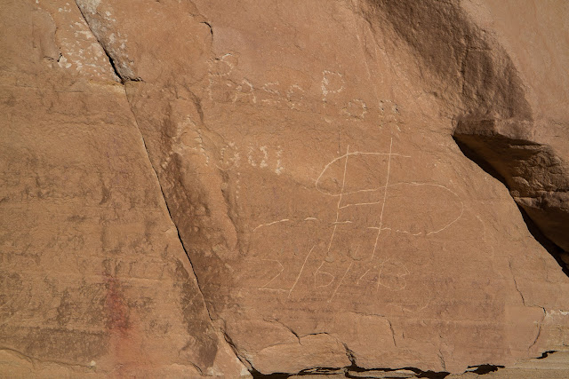 The hike back out seemed to go more smoothly then our hike in and we was able to reach the side canyon we entered in good time. We then began to look for another rock art panel and was able to find this one as well. The problem was it was in direct sunlight and washed these faded pictographs out. There were even some old names carved into the walls nearby.