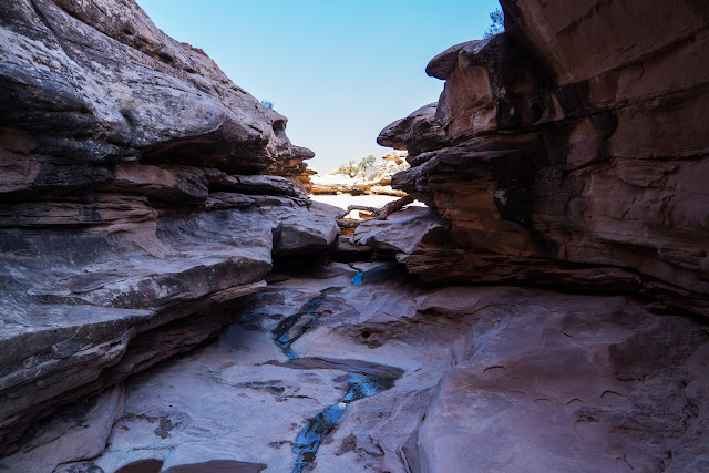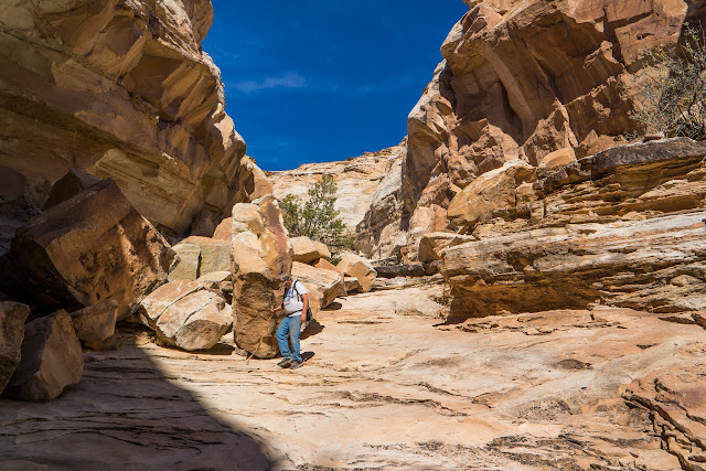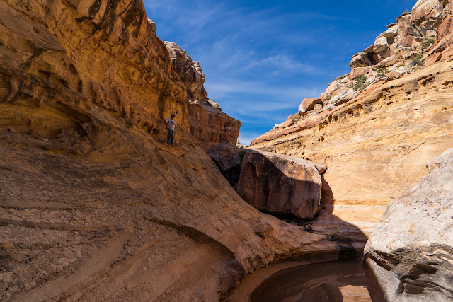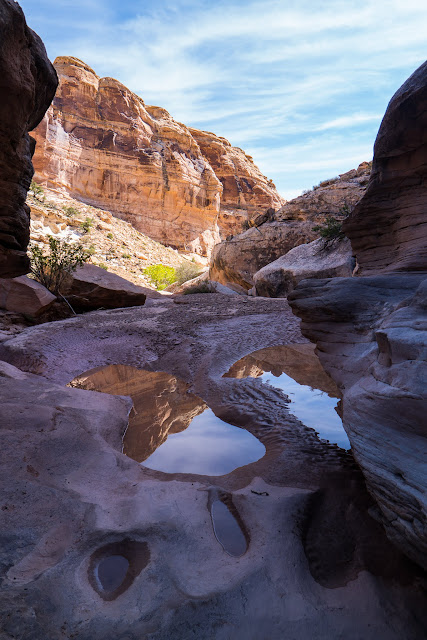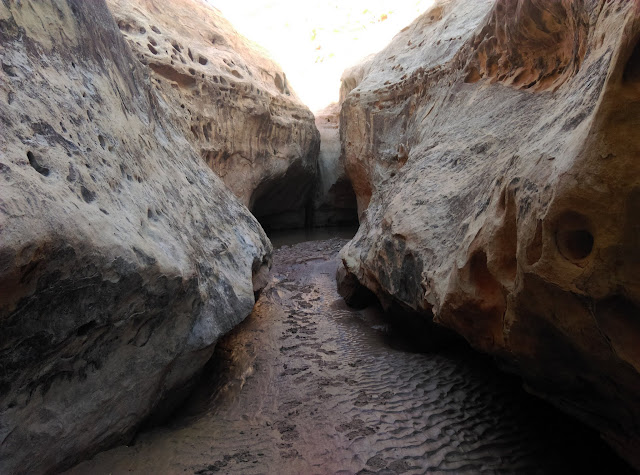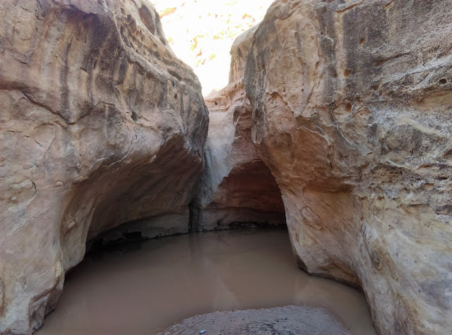 We finally were nearing the end of our hike when we came to pool and a boulder obstacle to get around. Trying not to get wet we had to cling to the walls to get around the pool, almost falling into the water, and then the climb over the boulder wasn't too bad. Due to the water I left my larger camera back but took a few photos with my cell phone. Any further progress up the canyon was halted due to a large dryfall.