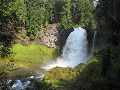 The next day we packed up and drove the rest of the Mackenzie Pass Byway, and then the lovely Highway 126 along the Mackenzie River. Yep, there was a campground here that didn’t have piped water, Ice Cap, and we once again found a perfect campsite within a couple of hundred yards of Koosah Falls. We hiked up and down the river, visiting Sahalie Falls and Carmen Reservoir while we were at it, and fell in love with this section of the river. It was roaring, it was icy, it was cascading over rocks and glistening though deep blue/black pools. Old growth forest, rhododendrons, ferns, currents of icy air and an occasional rainbow made this an unforgettable hike. After the smoke and heat of the Sisters, this was heaven. And it filled out our list with a day of pure WATER.