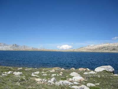 Then we hiked straight up the ridge to see the last two lakes in this chain—the smaller has no name, but the larger lake at the back is Goethe, after the German scholar. These last two last were incredibly blue, and seemingly barren—only rock and water. But we’re been assured that there are trout in both of them. We didn’t see any. But we did see the route up to Alpine Col---a rough trip over big talus that would get you into Darwin Canyon on the west side.