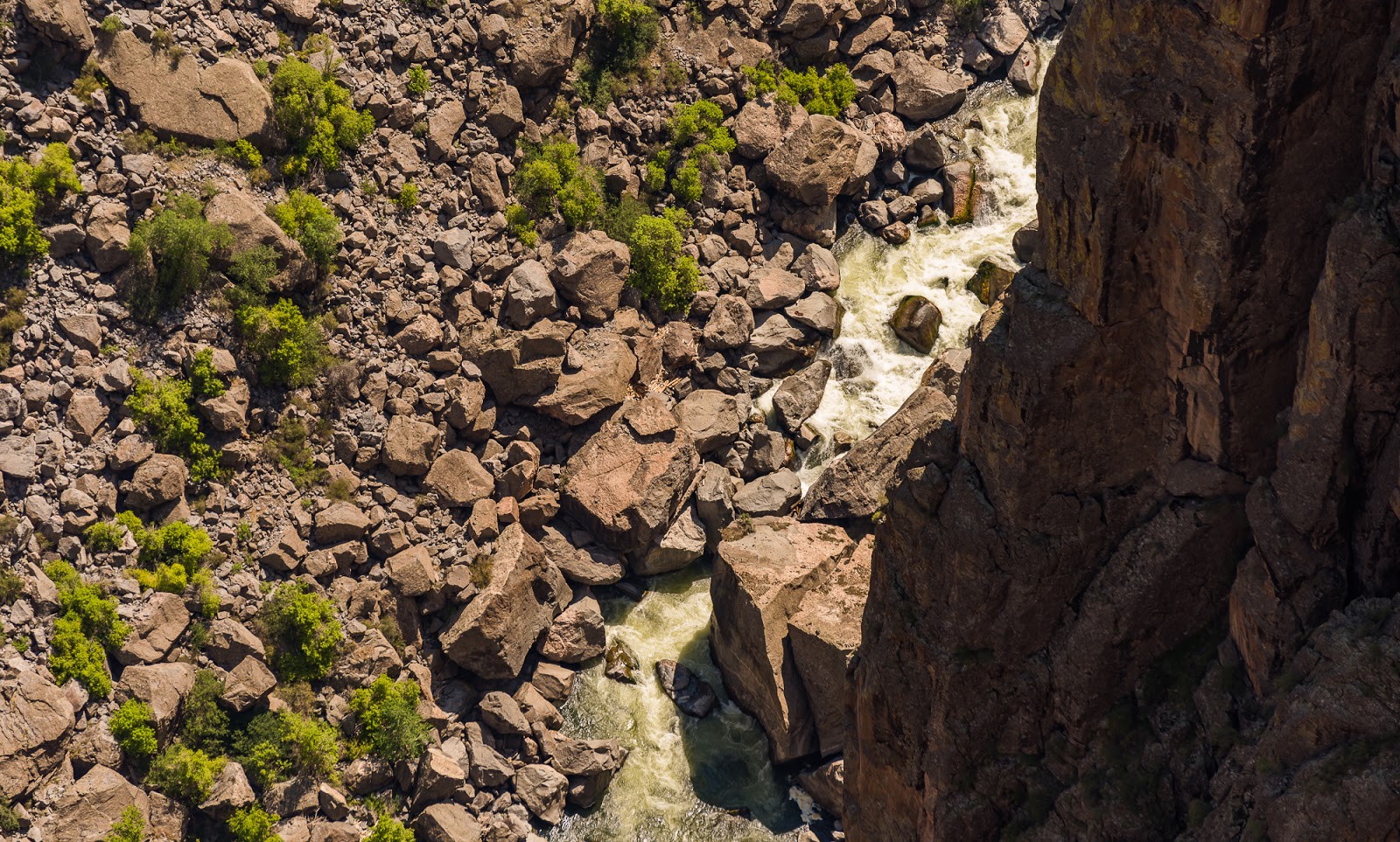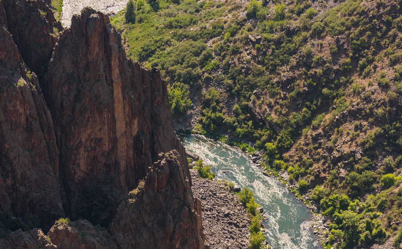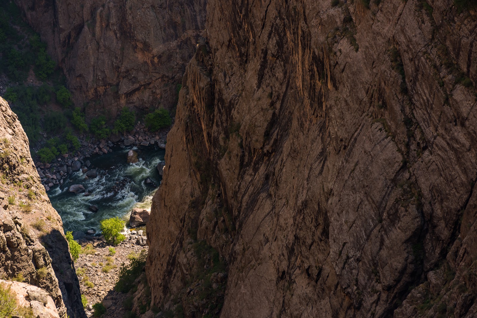 This detail shot is to show how the lighter stripes of rock in the canyon walls aren't just surface level coloration - they're actually complex intrusion layers of different rock that was forced into and through the main canyon walls. In this shot you can see how the lighter-colored stripes of rock are casting small shadows onto the larger cliff face because they are three-dimensional, not just surface level color striations like what you'll commonly come across in various canyon areas, etc.