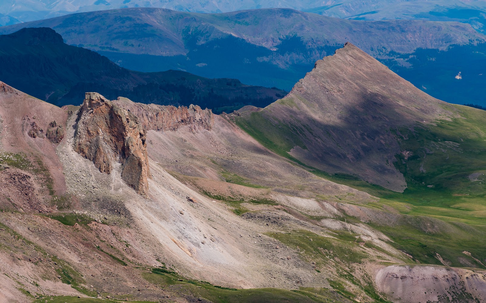 Neat textural detail on a gently-contoured but interestingly colored peak across the way in Wetterhorn/Matterhorn Basin.