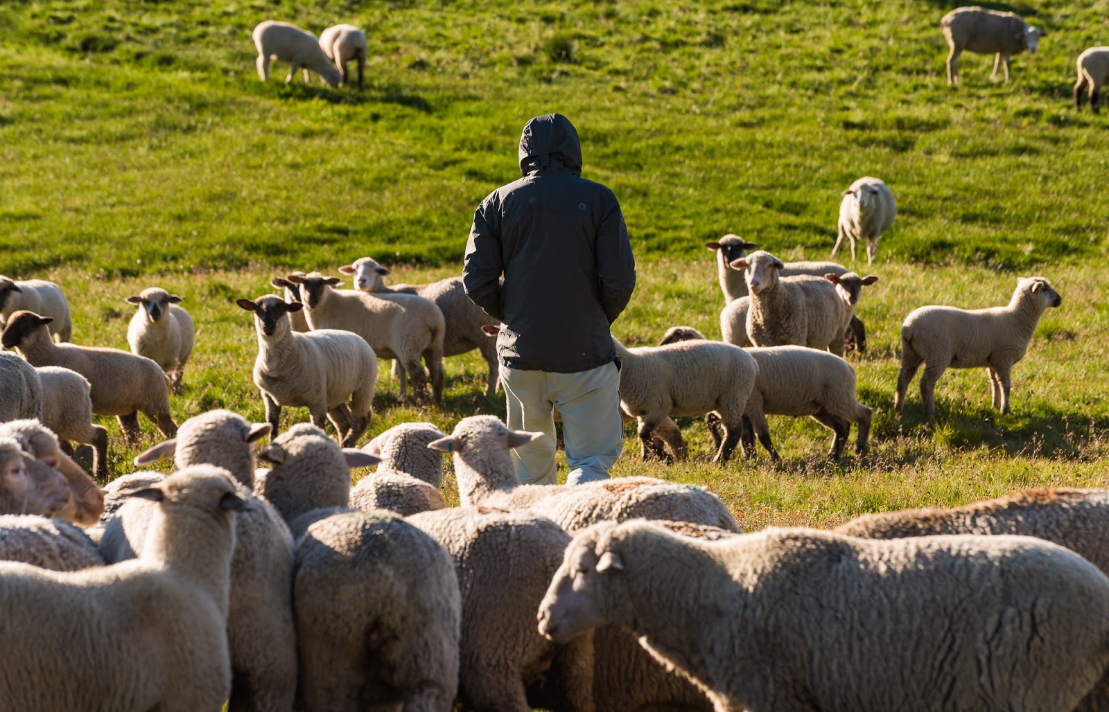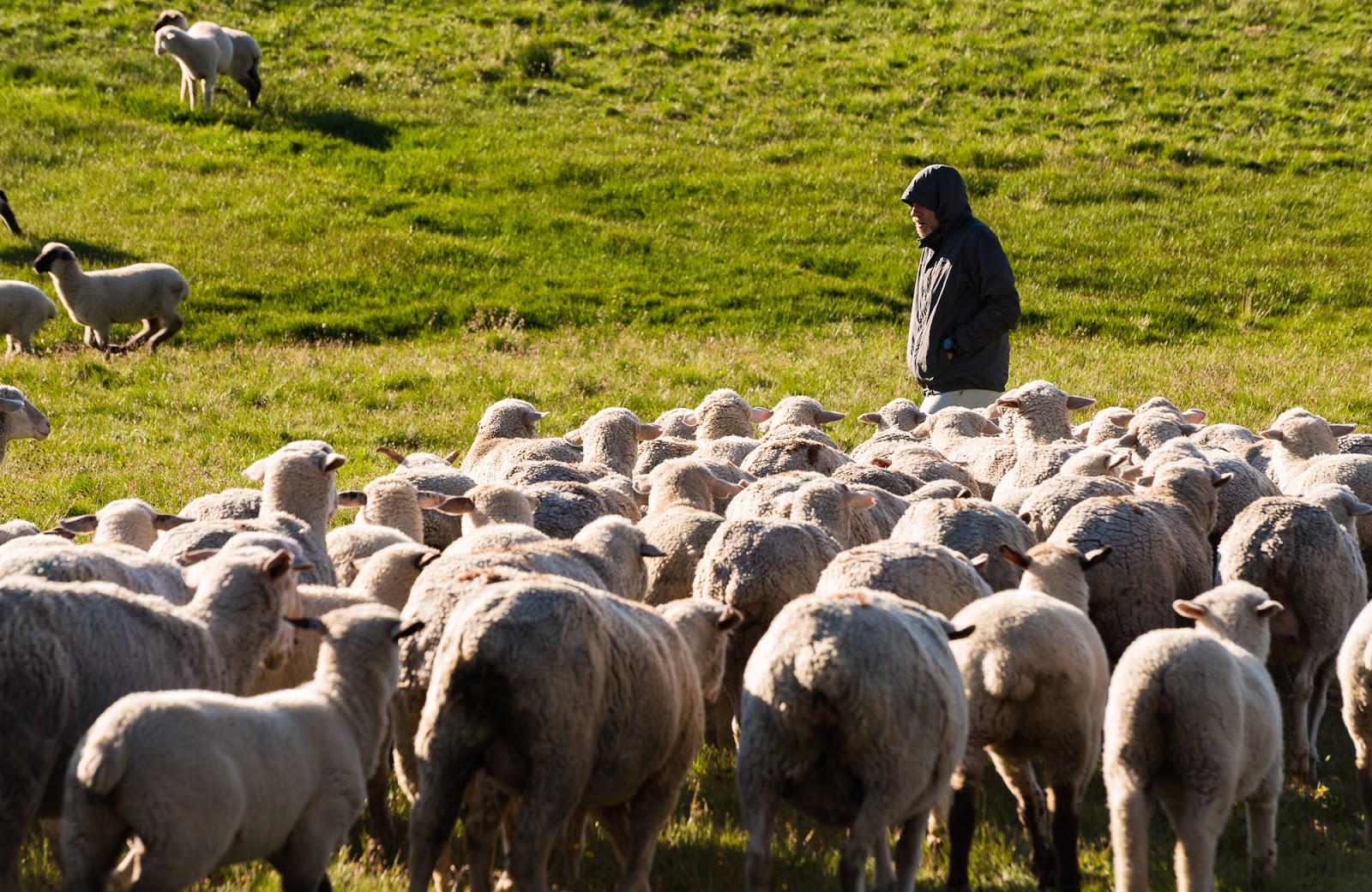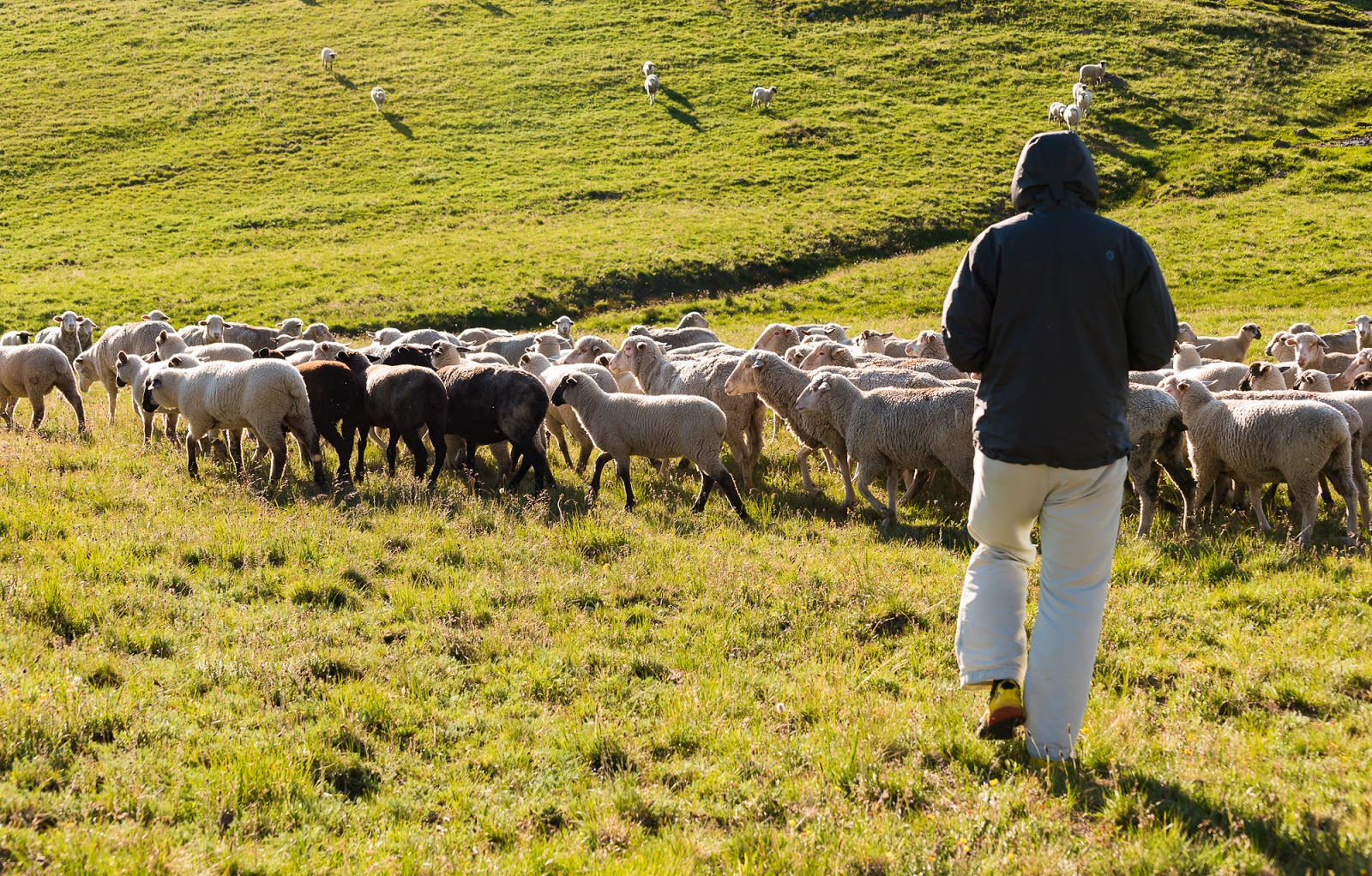 Claron thinks he might be able to lead the sheep away from our camp instead so he starts walking away from within the group of sheep...