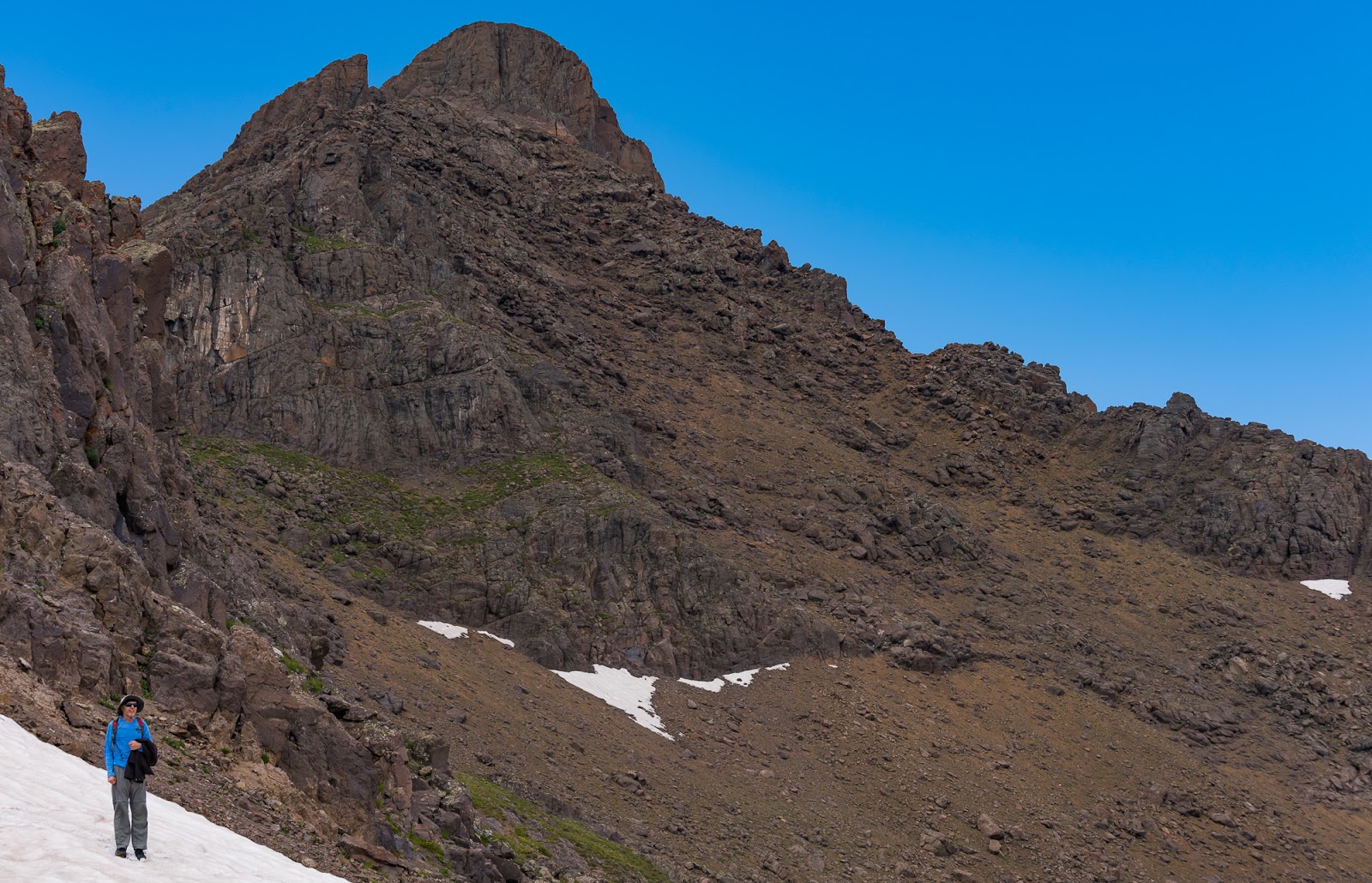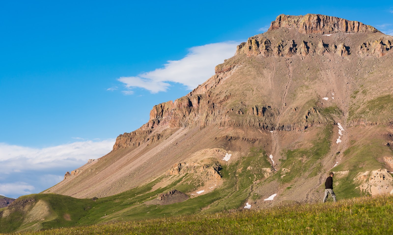 Jeff walks against the imposing profile of Uncompahgre Peak, as seen from our campsite.