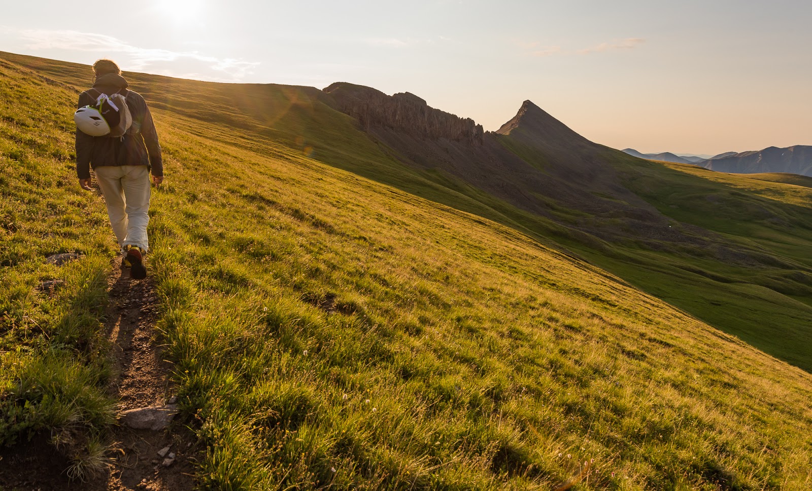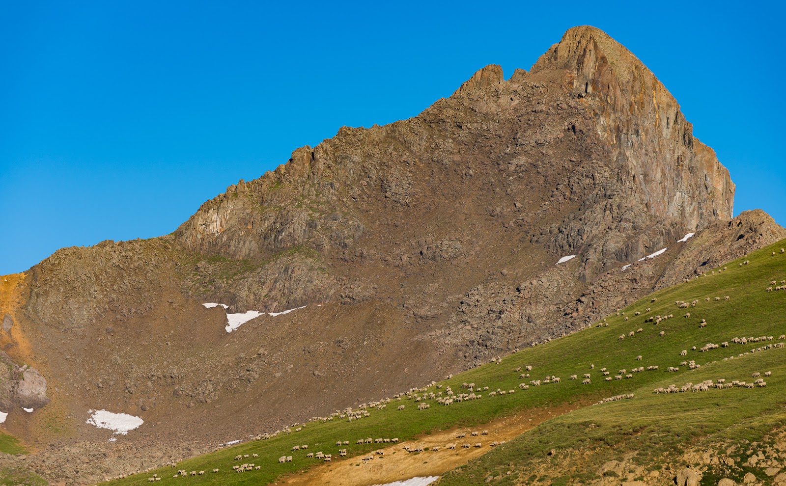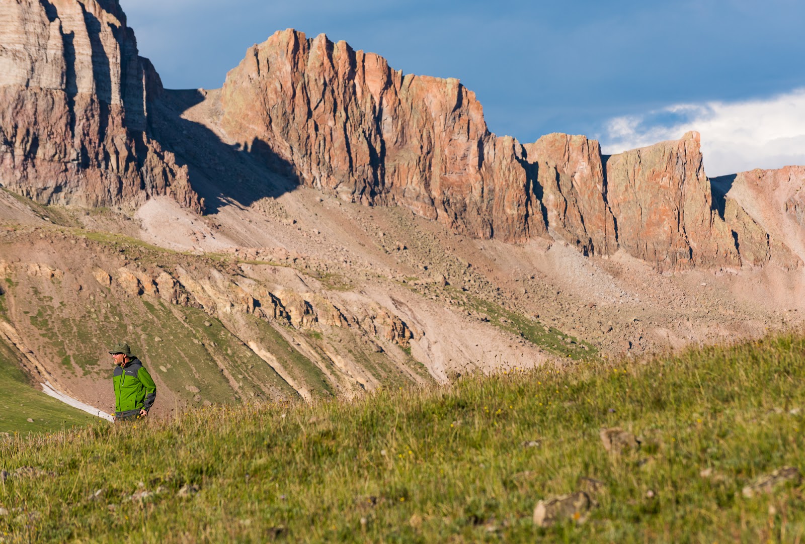 Mitch watches the sheep move against Uncompahgre Peak's imposing cliffs in the evening light.