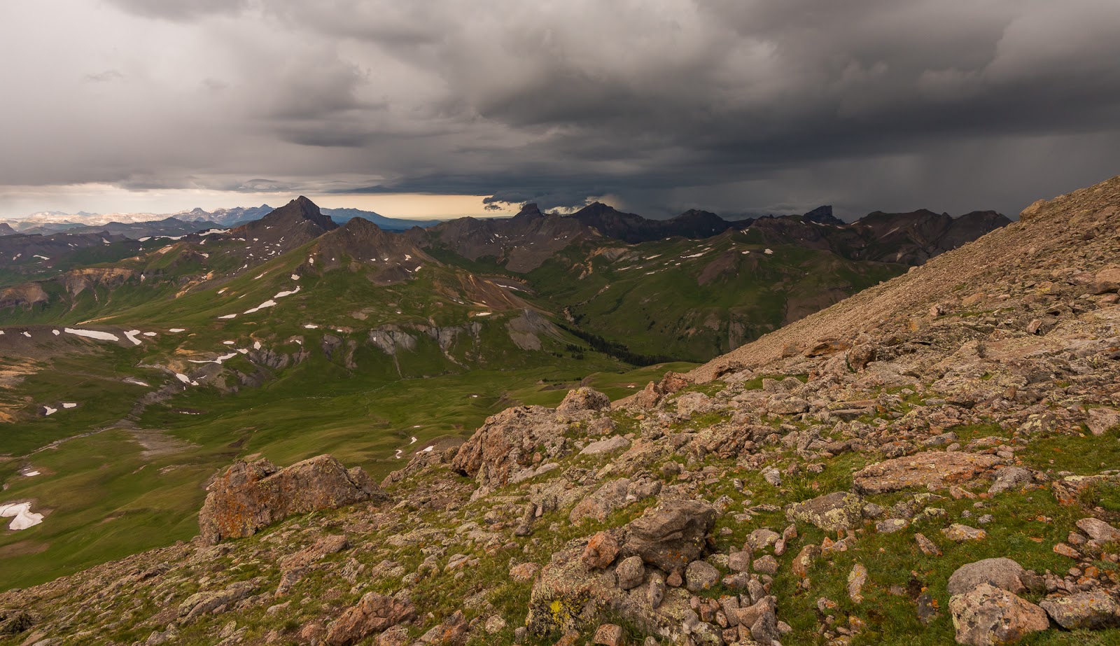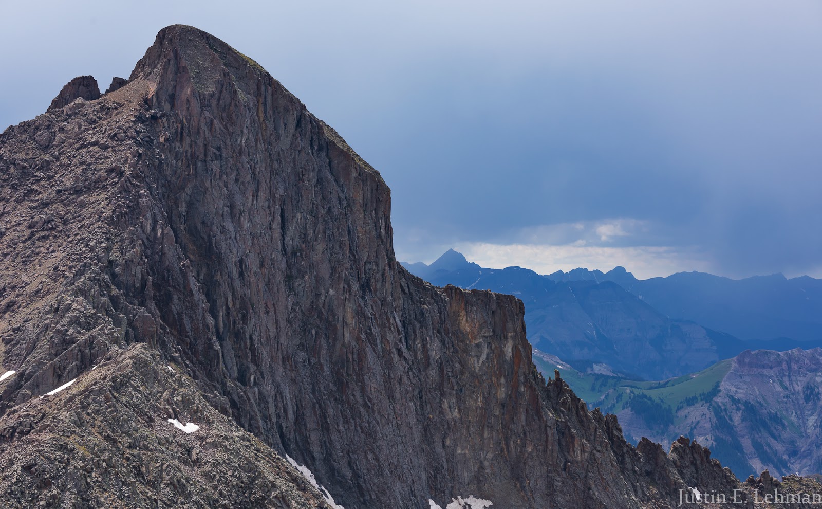 I really enjoyed this perspective of Wetterhorn Peak from Matterhorn Peak, especially with the stormy skies and Mount Sneffels and other more distant San Juan Range peaks beyond.