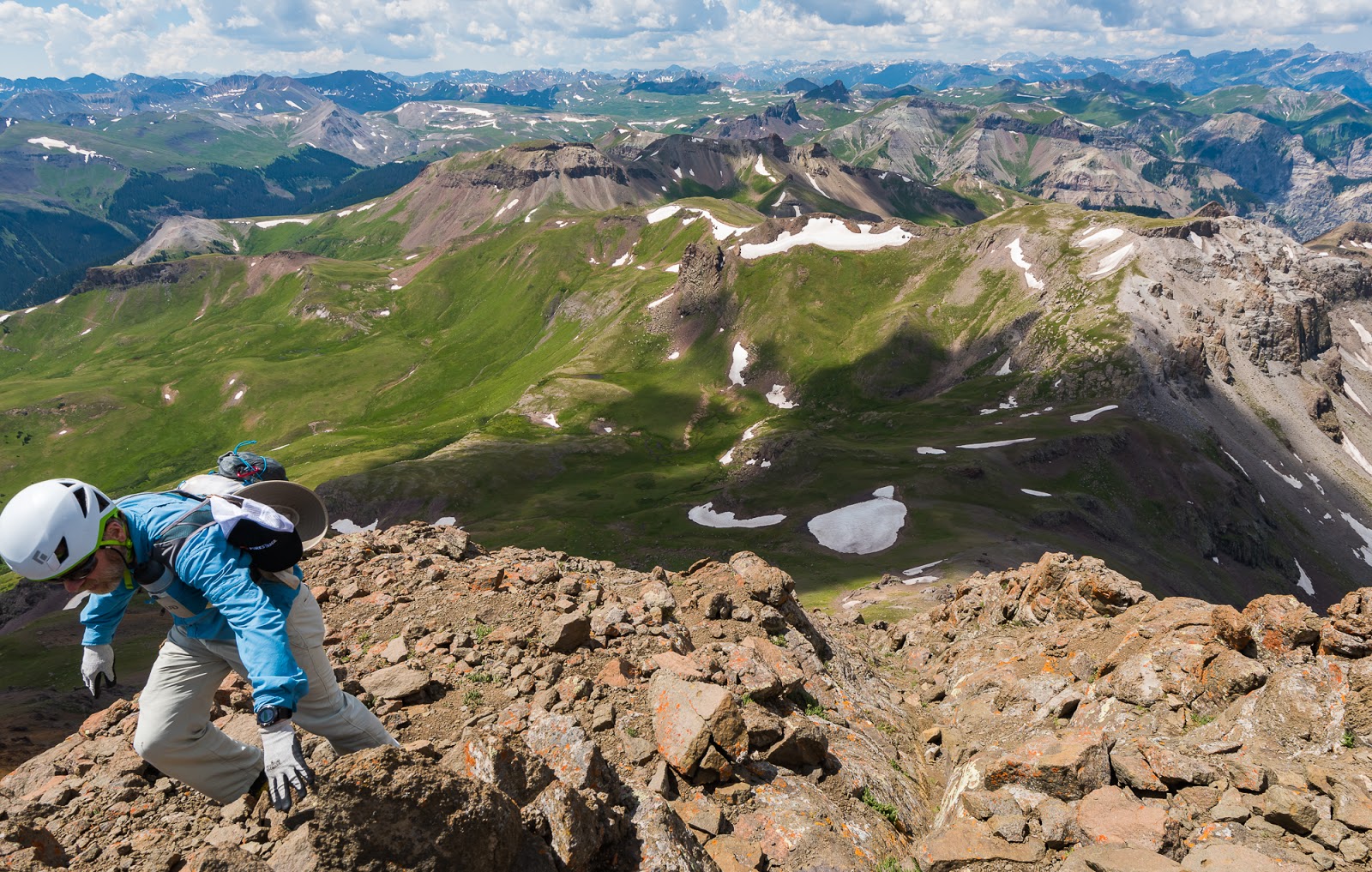 Jeff starts down the final scramble on Wetterhorn Peak.