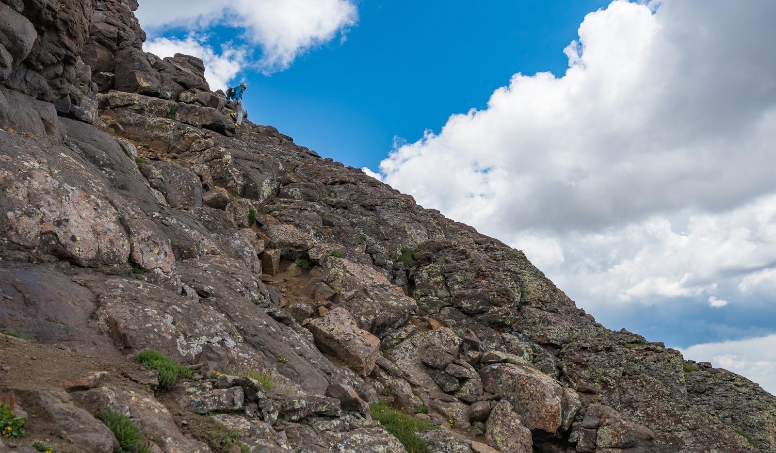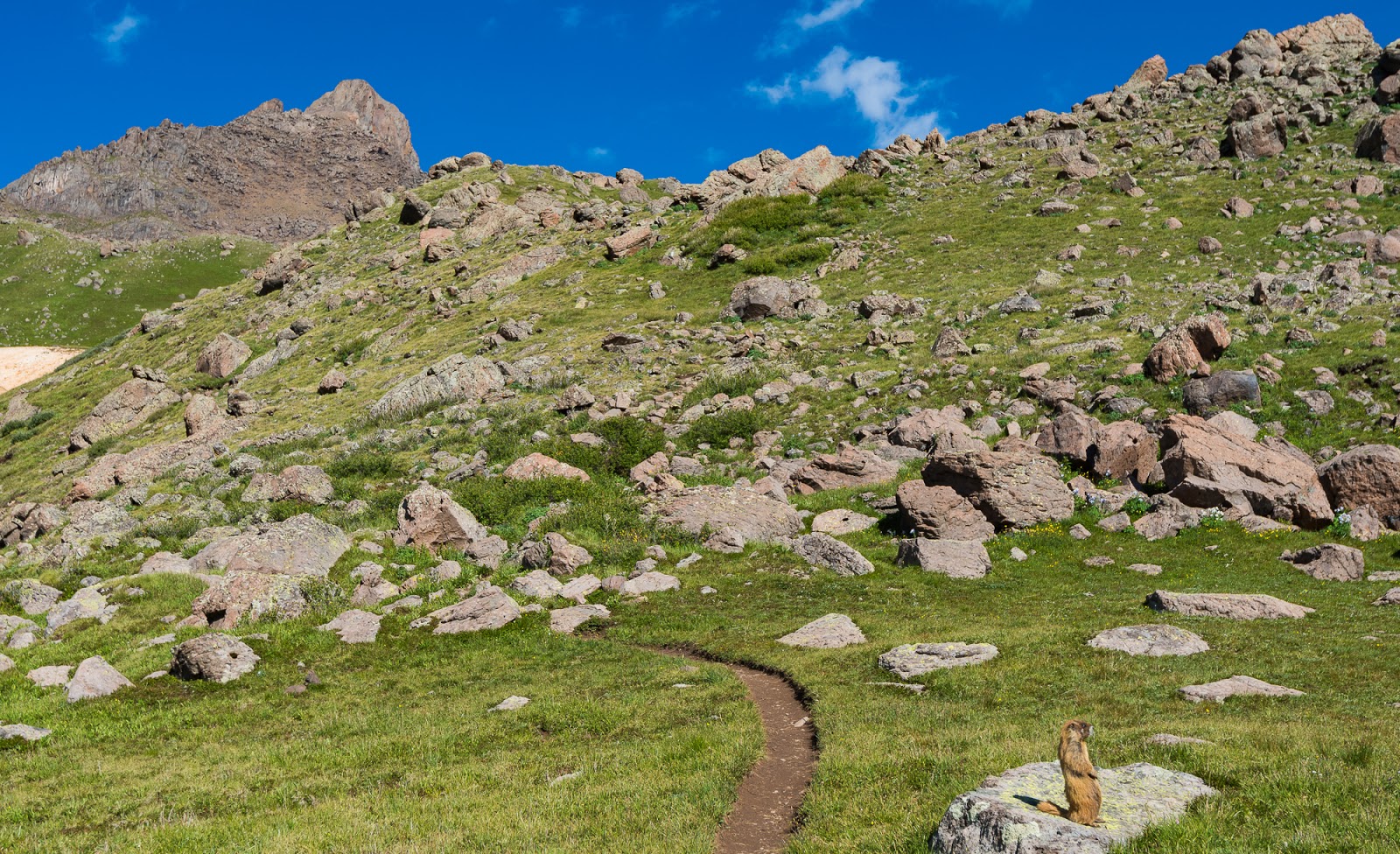 The terrain gets more bouldery as you progress upwards toward Wetterhorn Peak, but even though the terrain ultimately goes through a major boulder field there is good trail to follow all the way up to the high saddle (and just a bit beyond that too). Did you notice the marmot standing up toward the lower right? :)