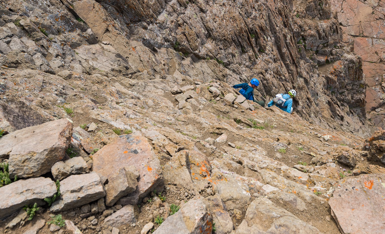 Looking down the final scramble on Wetterhorn Peak as Claron and Mitch continue down the steep scramble.