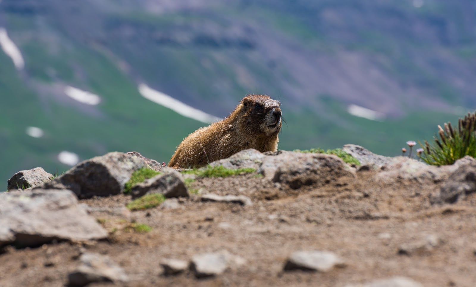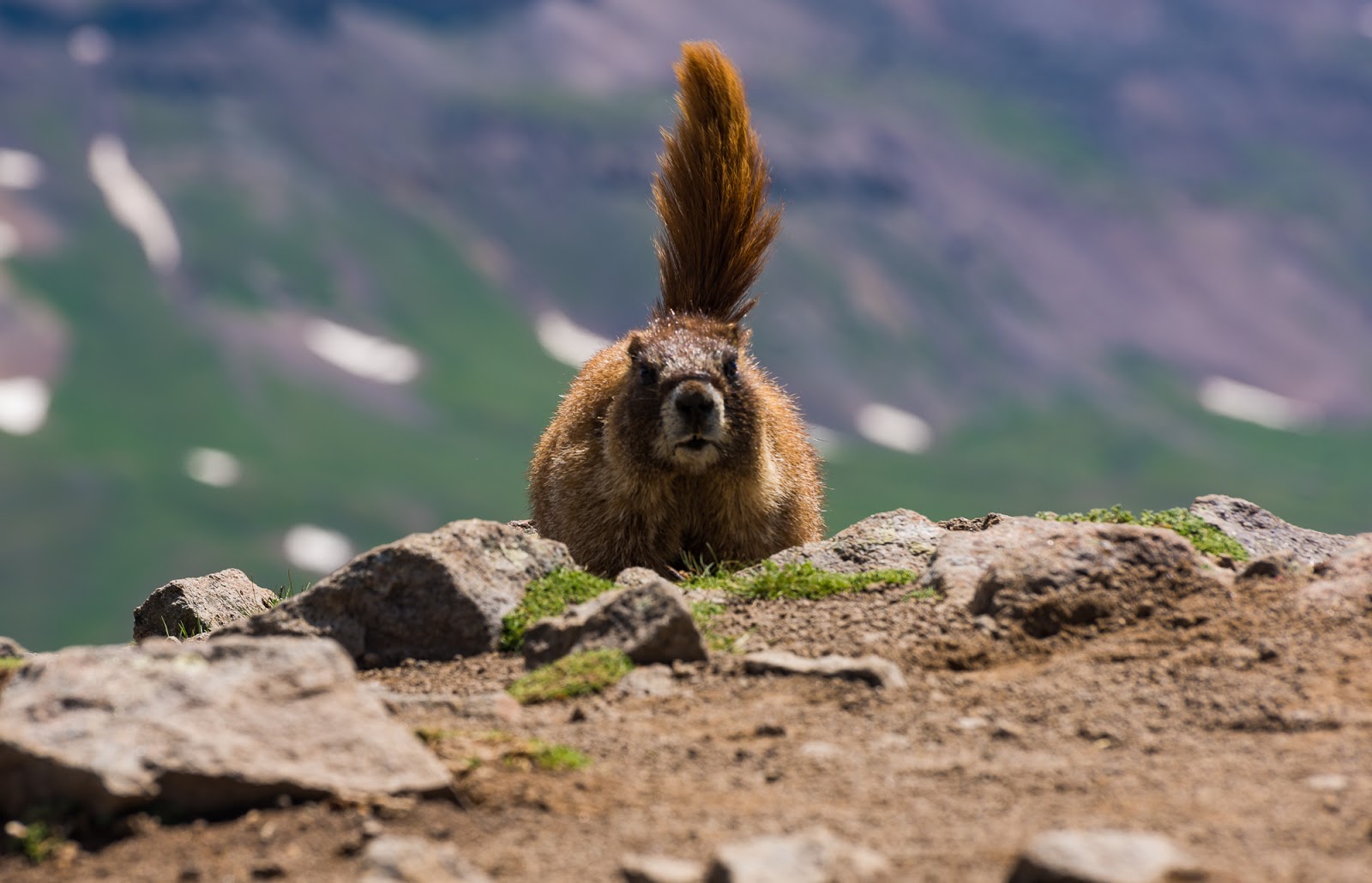 I was hoping for a shot like this: A marmot perched on a rock framed against the imposing bulk of Wetterhorn Peak's summit. Nice of the sun to highlight the marmot for me, and for the clouds to add a little dynamism to the sky. :)