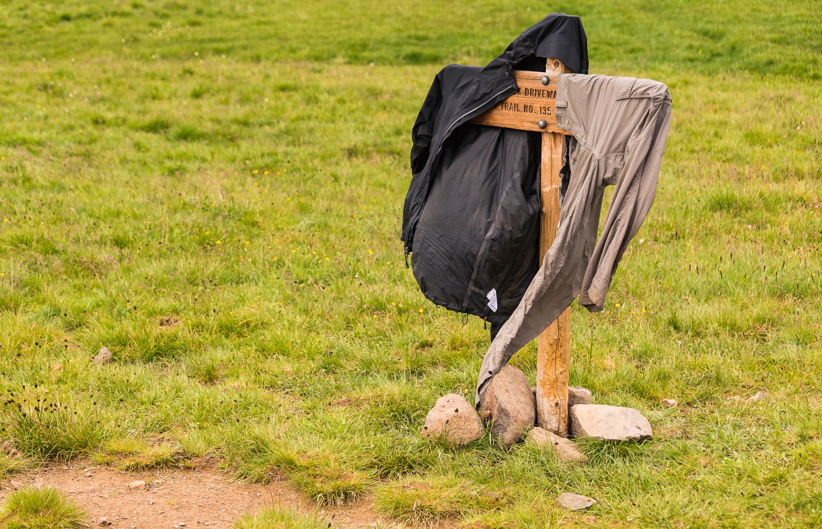 Putting the trail junction sign to good use after the storm with my rain jacket and the pants I was wearing during the storm hanging out to dry. We had gear spread out on the ground (which was occasionally problematic with the gusty winds that lasted for a good while after the storm had stopped precipitating - more than once, we had to chase various articles of gear across the countryside as the wind tried to carry it away). I also set up my large tripod that I use for my serious photography work on these trips and we hung things all over that as much as possible to let the wind help dry things out as much as we could.