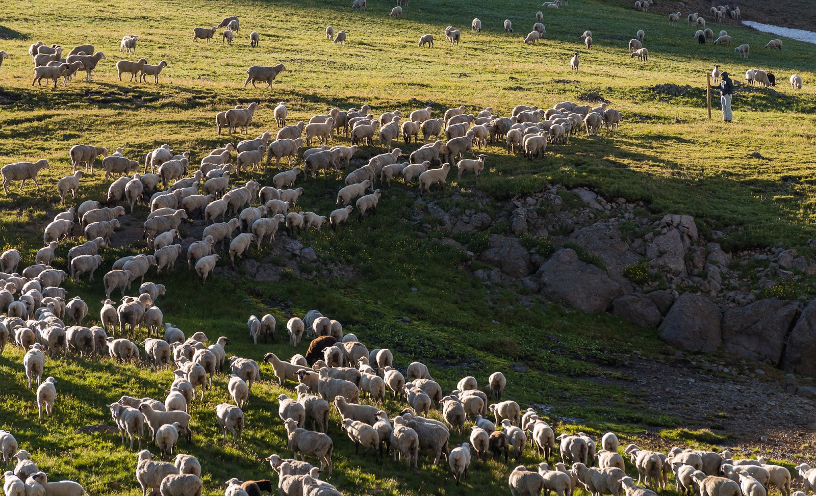 Detail on the slowly migrating sheep moving across the high pass and the slopes adjacent to it, just beyond our camp.