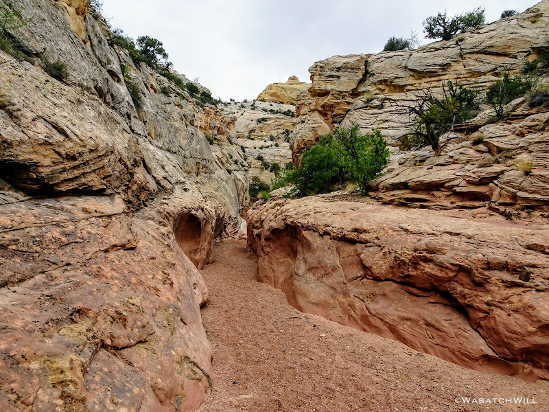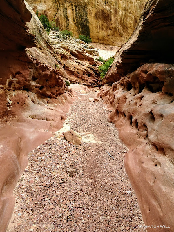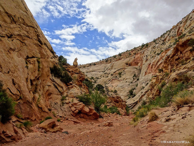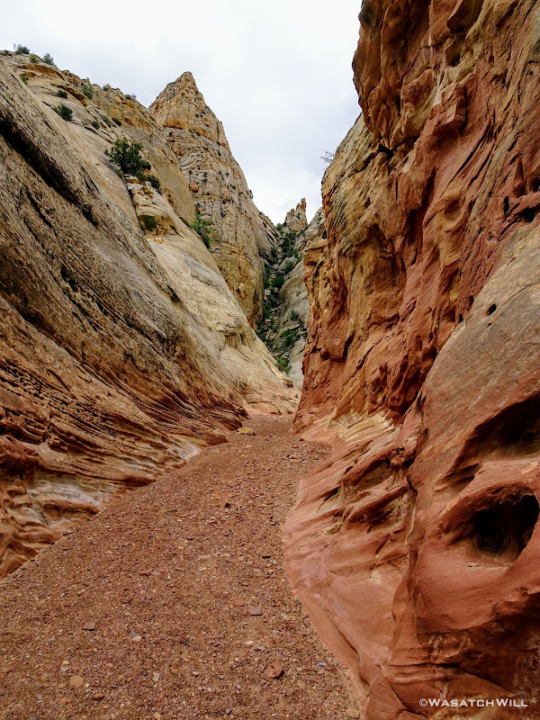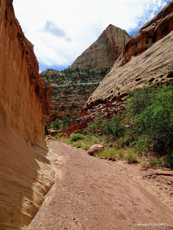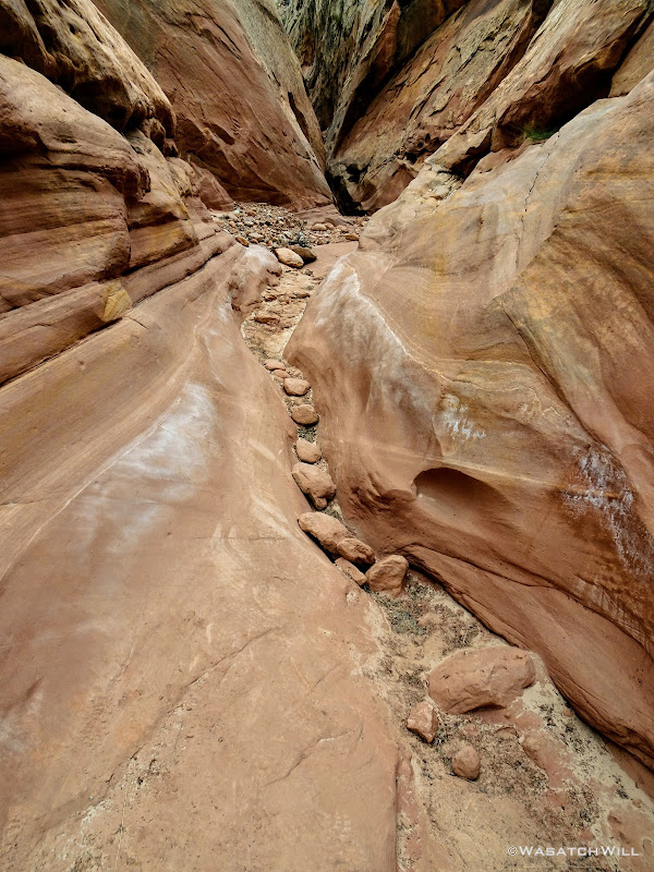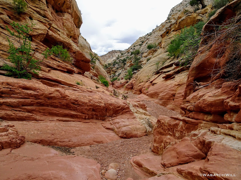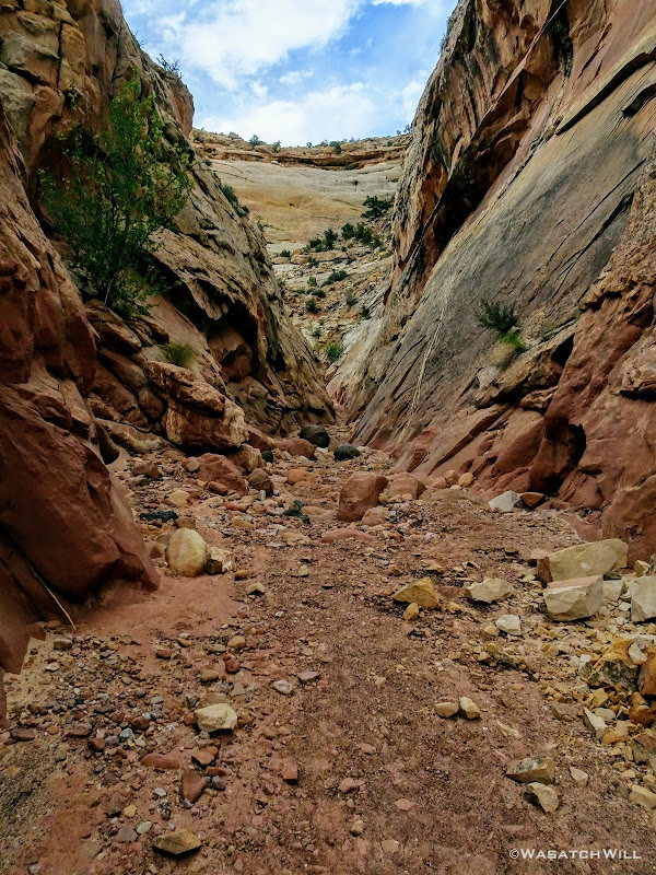 Notwithstanding the clouds behind me which I felt I was now racing, I looked back ahead down the gulch. This gorge through the Waterpocket Fold was about to get awesome! The race was on.