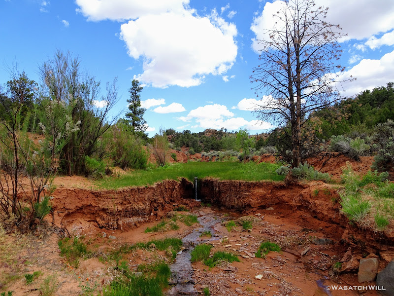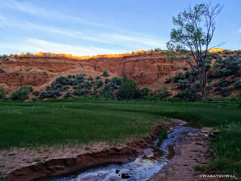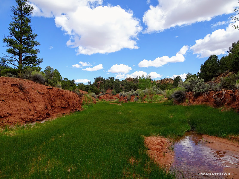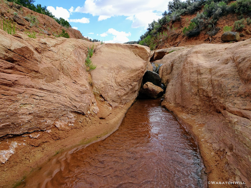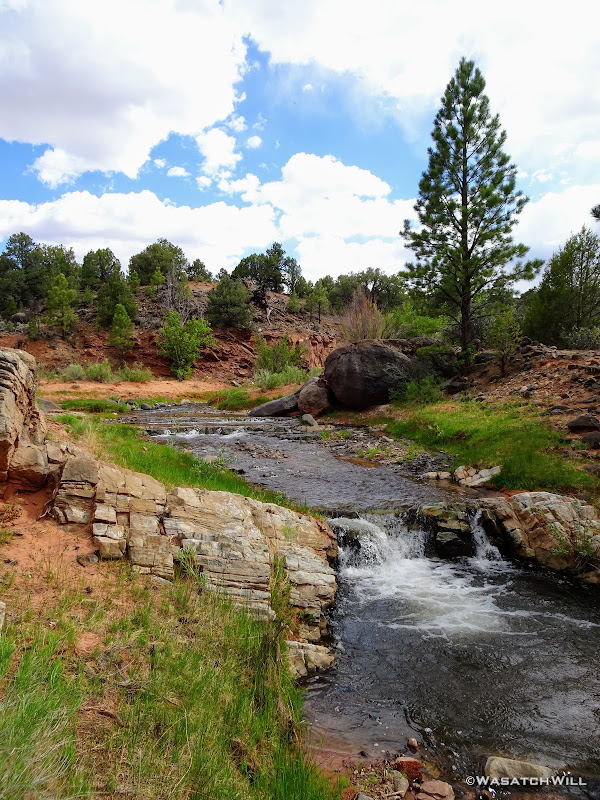 The creek was much gentler as it cut through the long grassy meadow, only interrupted once by a brief slab of sandstone where it had created an embryonic slot canyon.