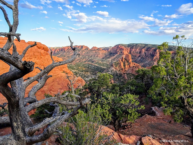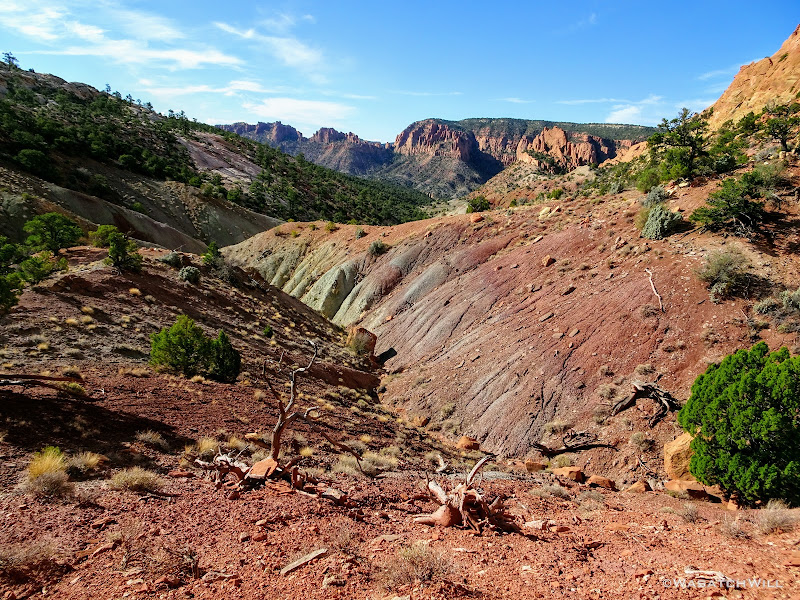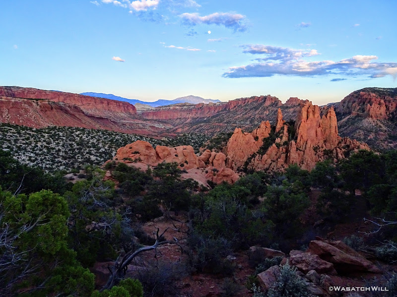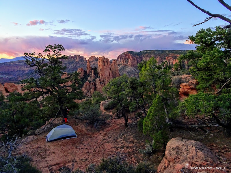 I continued on, first seeking a way to get down, over to, and up and over the saddle between the Salmon and Nick's Peak. When that failed due to impassable cliffs, even along the ridge itself, I sought a route down the drainage leading around the southern edges of Nick's Peak. That all too ended up in cliffs and impassable pour-offs time and again. Stumped, tired, and now in the final hour of any usable daylight, after hiking about eight+ miles in about five hours, I called it off. I found a small flat in which to make camp for the night, still well over three miles away as the crow flies, more by foot, from my desired destination for the night. I now had some new choices to think over through the night as I rested in a remote and rugged edge of Dixie National Forest.