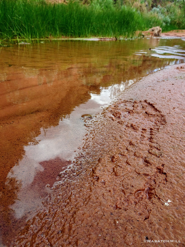 Another 45 minutes later, now about 9:30 AM, I reached one of the spots I had marked out as a possible, but uncertain, water source and what was more or less the mouth of Upper Sheets Gulch. There was water there indeed, and it even flowed on and off for a ways down through the upper reaches of the gulch before vanishing for good. I'll remember this should I ever hike this route again with wife, kids, and/or friends in the future.