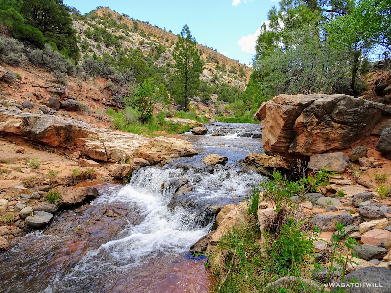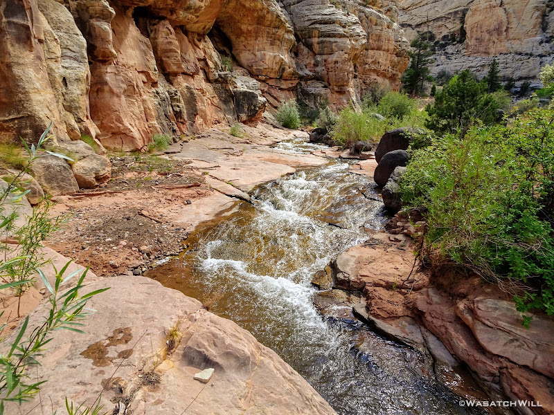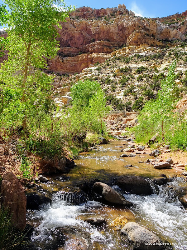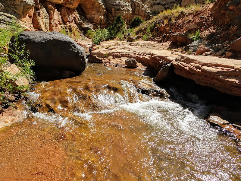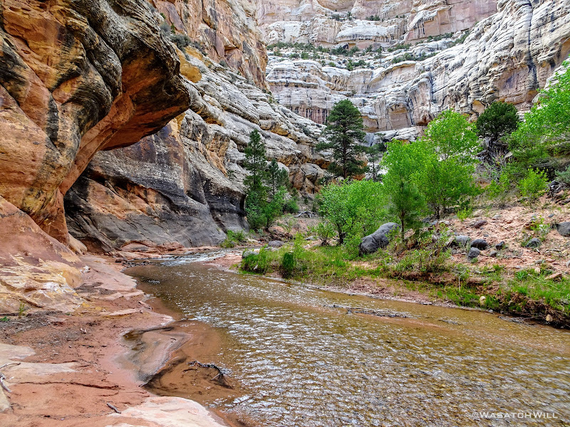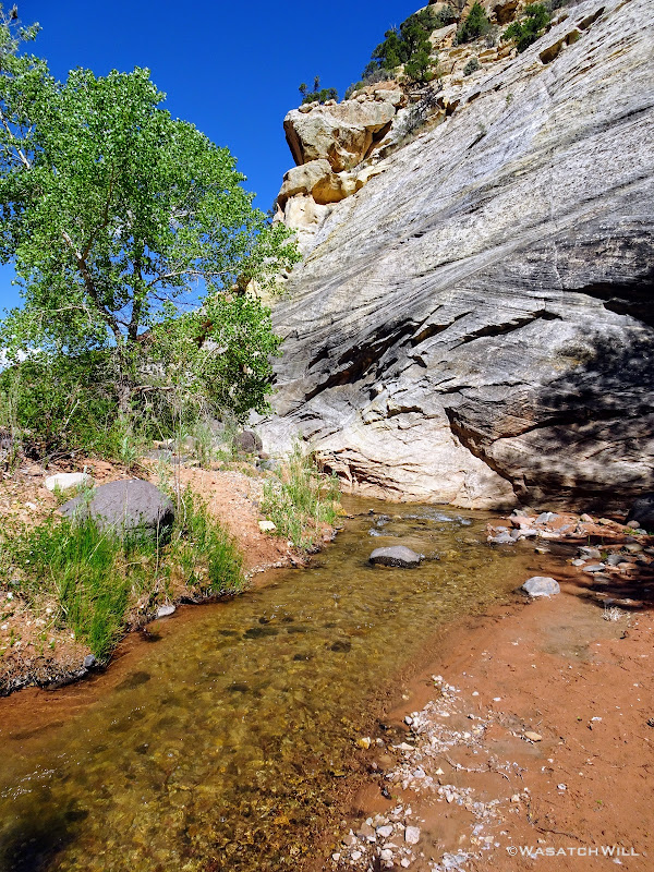 The path followed is largely a cattle path still used today by ranchers who, with special permission from the National Park Service, drive their cattle herd back and forth every spring and fall through the park between Boulder Mountain and Notom Ranch or the greater Strike Valley. Due to the creek draining off of active pastures, E. Coli bacteria has been confirmed multiple times in the creek, so it is extra important to ensure one has an effective and functional filter or other water treatment method.