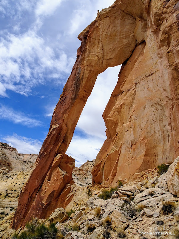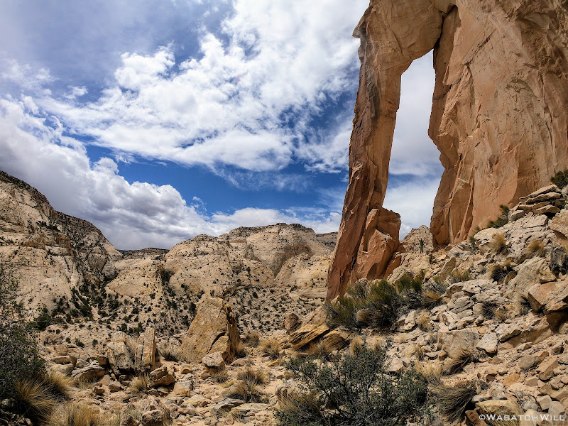 While racing the looming dark clouds behind me, the skies in front of me had remained blue. Then, as if by answered prayer, there was a break in the clouds behind me. They gave way to some blue sky and the clouds that remained lightened up to a friendlier looking white. I paused for a good rest on a low lying ledge beneath the great arch about two-thirds of the way down the gulch and re-fueled with some snacks and fluids. I then left my pack and climbed up the other side of the gulch to get an up close look at the arch.