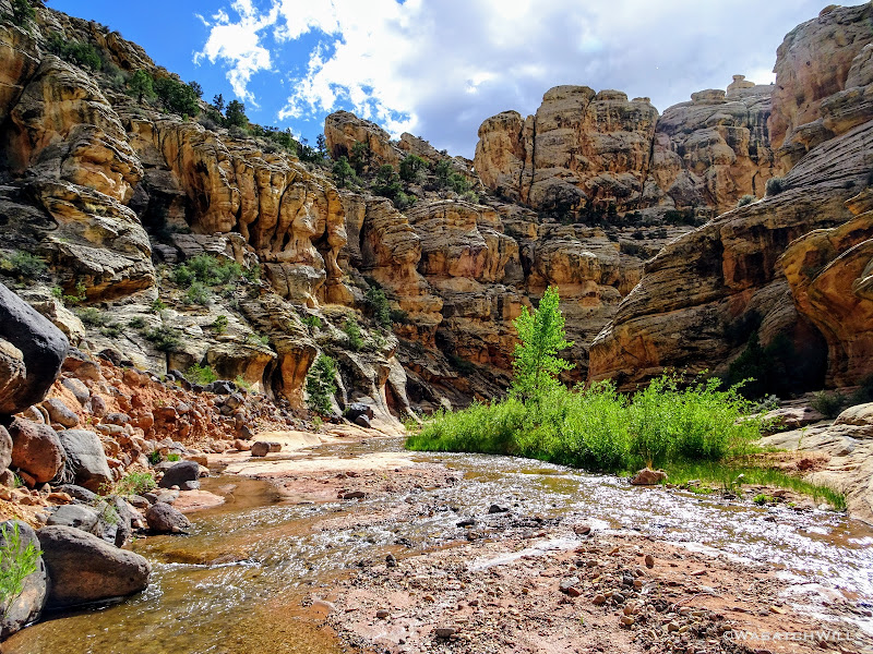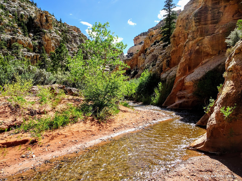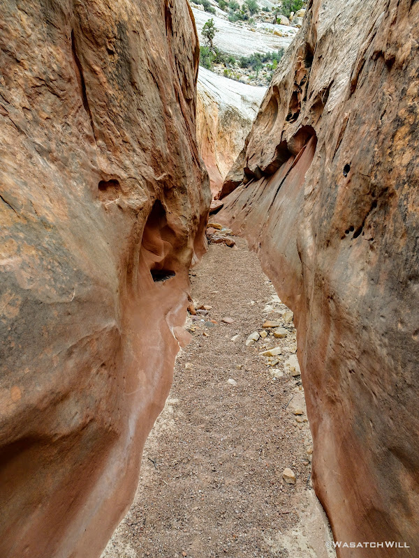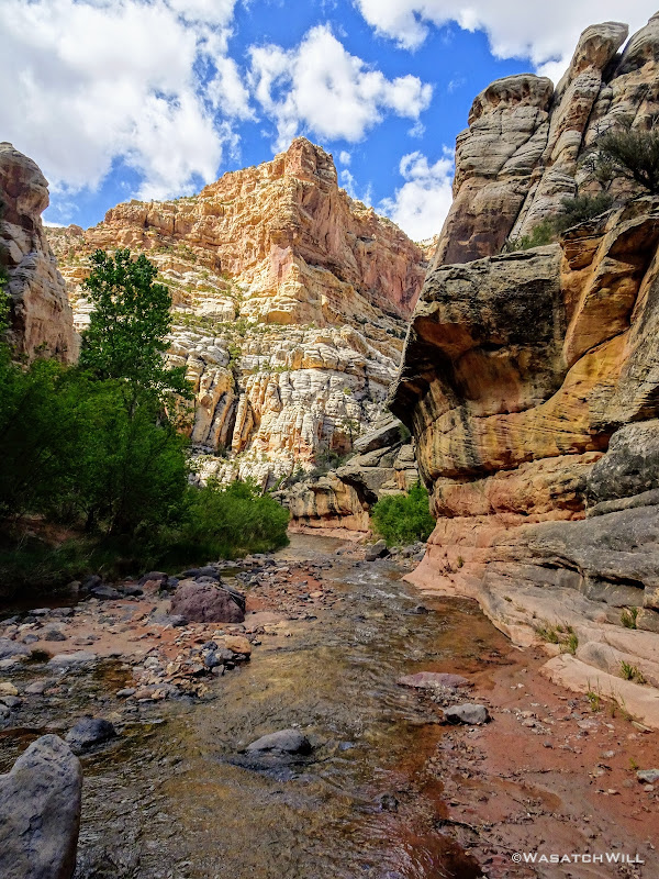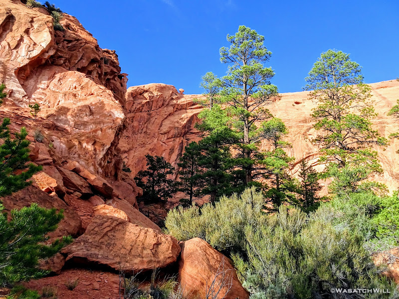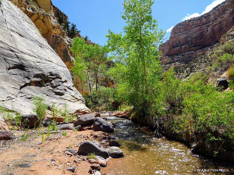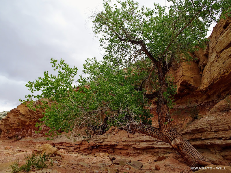 Finally, after passing through the final, and perhaps narrowest of the slots the gulch had to offer, I was in the clear for good. A Box Elder stood at the gates, as if it were holding a branch out to high five me for a job well done. It was only about 1:30 PM now and I knew the trailhead was now only about a mile away.