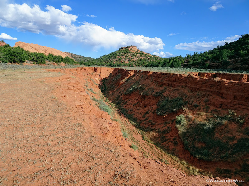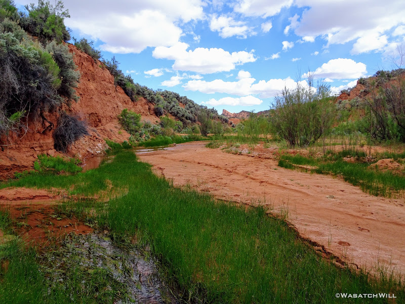 By 10 AM, I was now well into Sheets Gulch. Somewhere just after the water source, I had crossed back over into the Park boundary. If there was a sign marking the boundary, I missed it. After further considering the distance I had just traveled in the last 2 hours and the elevation I had descended (over 5 miles and over 500 feet in just over a mile of that stretch), I was now committed to finishing it out. I alerted my wife of the progress I had made and made arrangements to be picked at the same trailhead as planned at 2 PM rather than 1 PM. I also asked her to keep an eye on the weather radar and update me of any weather heading my way. Some dark clouds were brewing up back up toward Boulder Mountain, but I knew the feeders for Sheets Gulch were all much closer and that nothing from Boulder drained into Sheets. Still, I grew a little nervous at the sight of the clouds and hoped that such storms continued to track northeasterly in their typical pattern. Perhaps more than any other trip, this one served to make me more grateful than ever to have picked up an InReach when I did for its 2-way communication abilities.