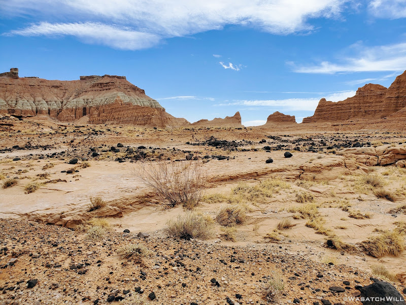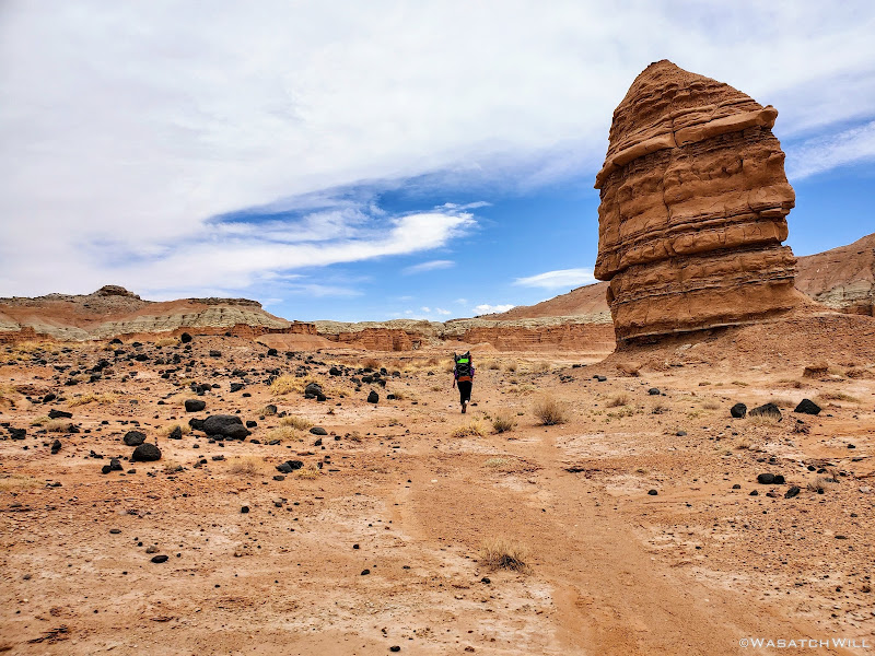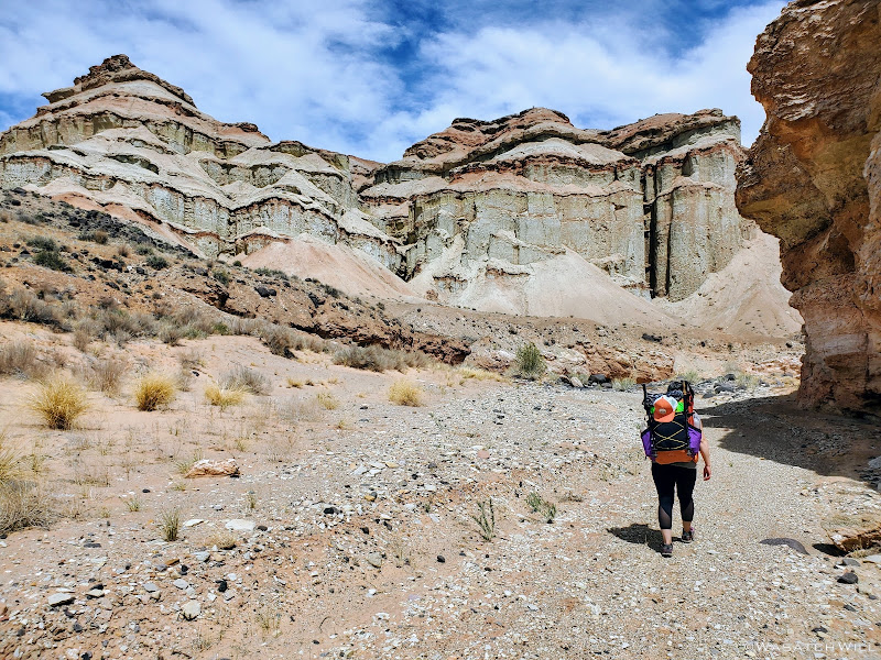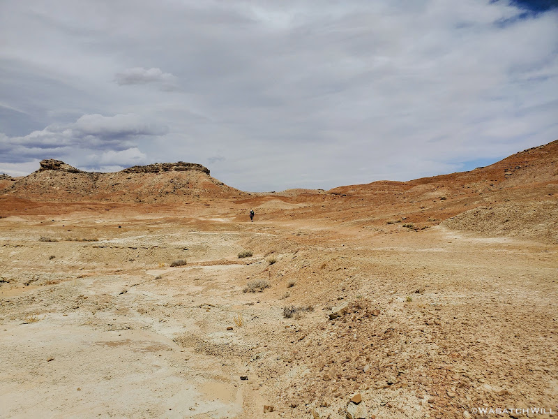 Beyond a couple of named landmarks nearer to the trailhead, what trail there is through patches of the low valley quickly vanishes for good and the landscape thereby becomes a "no man's land". Oh, and water sources are very scarce out in this region. In fact, aside from what you can bring in yourself, there is none to be found for several miles from the trailhead. And even that was a gamble for us. Our ability to find water in a spot I had spied on satellite, not too far from a spot I aimed to camp, would dictate the agenda for the remainder of the trip. We'd each pack in between 5 and 6 liters of of water to ensure we had enough to get back out to the car the following day if efforts to find water near camp came up empty handed. In such a barren and drought stricken land, even that could have been risky.