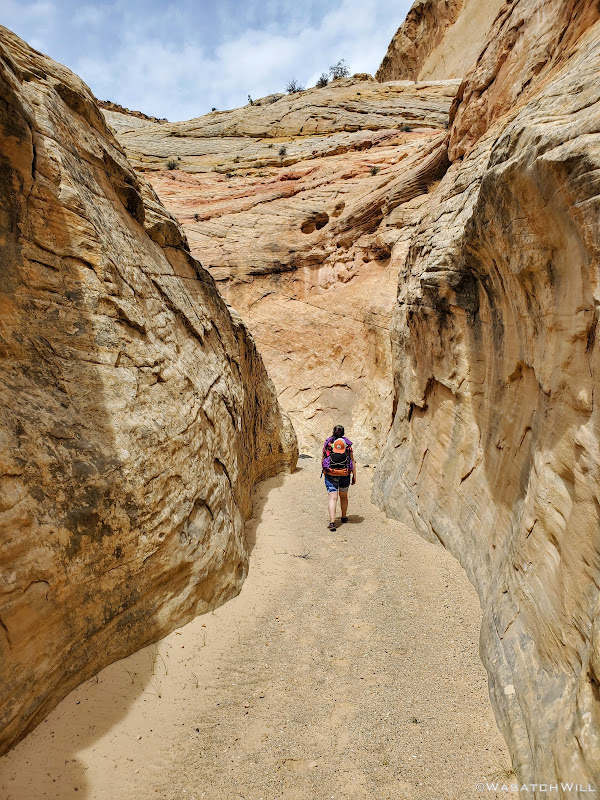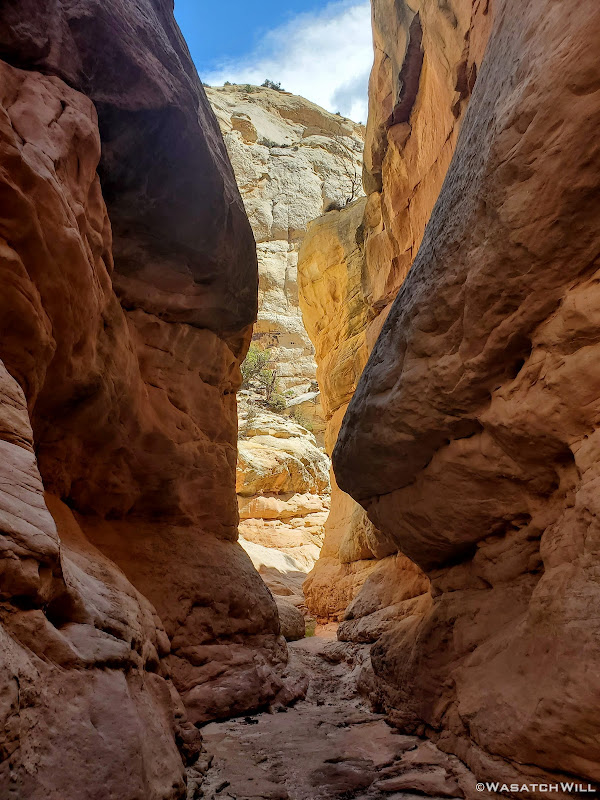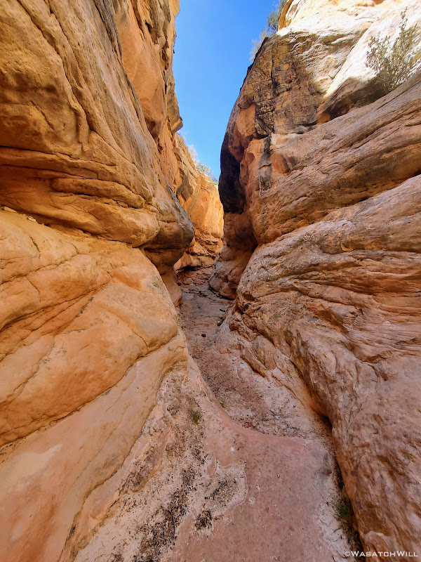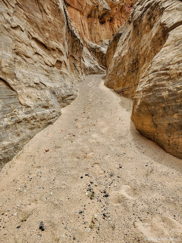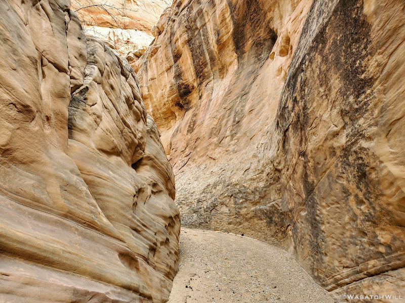 So instead, we made our way back down to another fork in the canyon we had passed by on our way up and wandered up that for a bit. It had a very smooth and sandy bottom and made for a very enjoyable walk. Here the walls would narrow up in spots and flirt with becoming a true slot at times before backing off again.