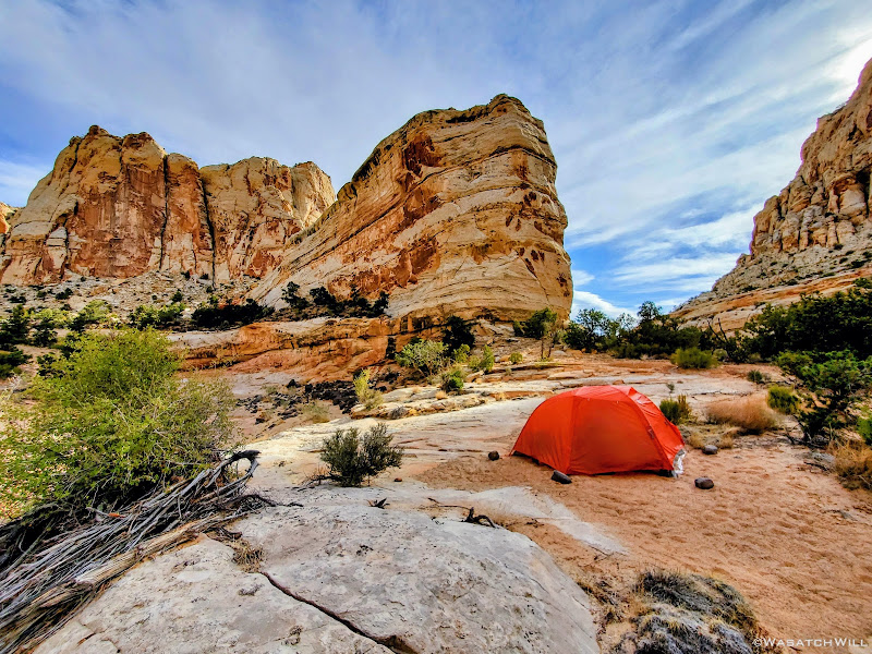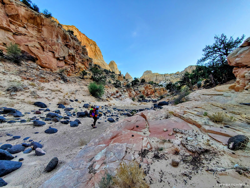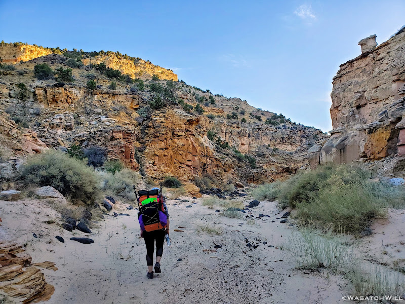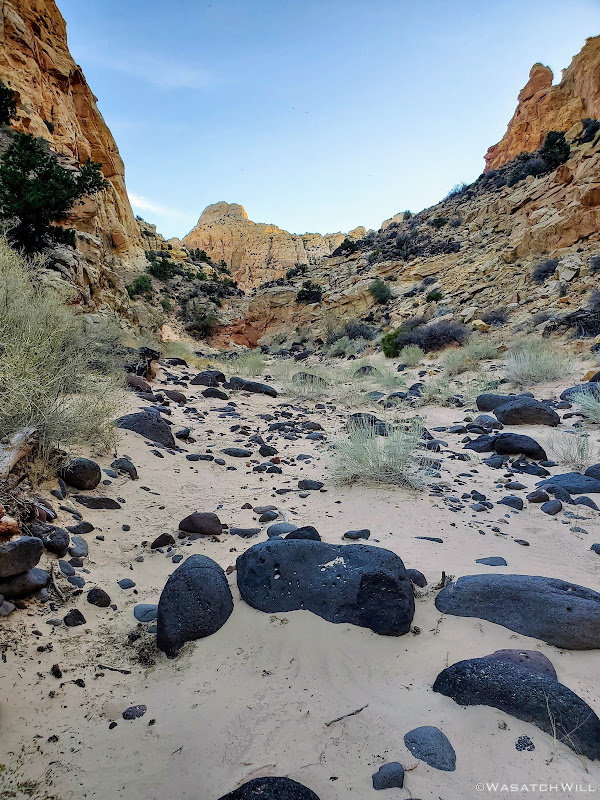 With the dawn of morning, I emerged from the tent and set out on a hunt for water while leaving Jess be to sleep in a bit. Again, finding water was as much of a mission as the inscription of Jessica's ancestor we were after. There was no guarantee of any reliable sources in the area, but I had marked a spot that looked promising on satellite up in a side canyon near our camp. A couple other potential spots I had marked out further down the canyon we had come up the evening before had turned out to be empty and dry.