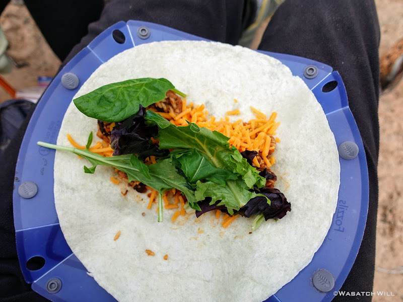 Some time in the evening, the winds began to settle down a bit and we took the opportunity to come out and make dinner. Tortilla wraps with pork and rice, salad greens, and shredded cheddar cheese was on the menu tonight. For this trip, we also employed a new kitchen setup with an MSR Titan Kettle and MSR PocketRocket Deluxe Stove.