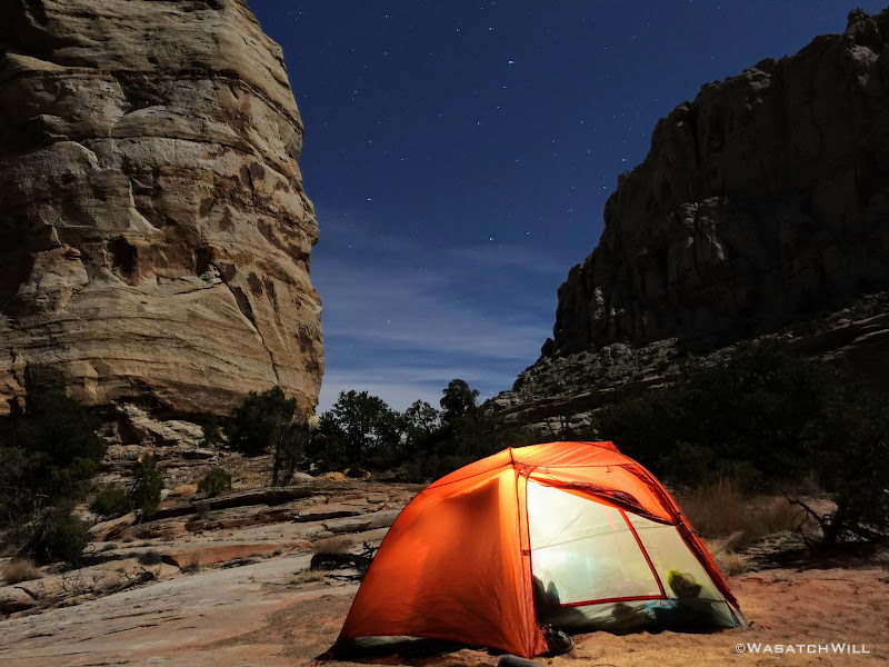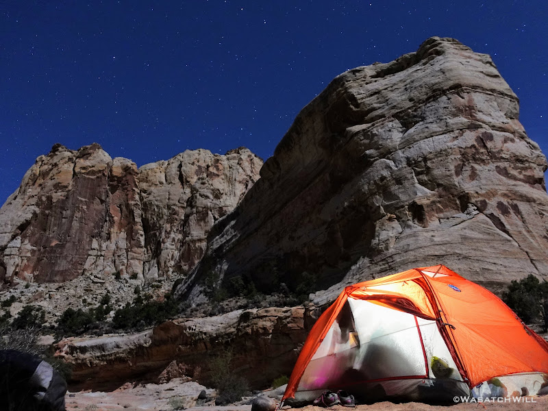 Ultimately, we failed to beat nightfall to our camp. Our last mile was in the dark with headlamps drawn out and activated. When we arrived at our desired site, we quickly set up camp, and had dinner before retiring to our tent for the night. We were excited to put our brand new Big Agnes Copper Spur HV UL2 tent to use. What does the HV and UL stand for, you ask? High Volume and Ultra Light. It was tough deciding between this one, a Nemo Dragonfly 2, and the newly released Sea to Summit Telos and Alto 2 tents. The latter appear to be rather innovative with lots of bells and whistles on it. In the end though, we scored the biggest discount on the Big Agnes. It too offered a lot of features and proved to be a great upgrade from our nearly 15 year old REI Half Dome tent we would typically take on a trip like this. It's nearly half the weight, comparatively roomy, has easy to access storage pockets, large gear loft, and the fly doors have the ability to be set up in a porch mode with trekking poles. I think we're going to love this tent for a long time to come!