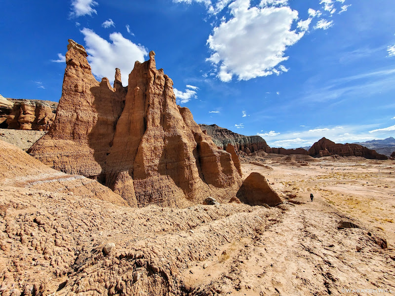 Jess approaches some pinnacles along the canyon wall up ahead.