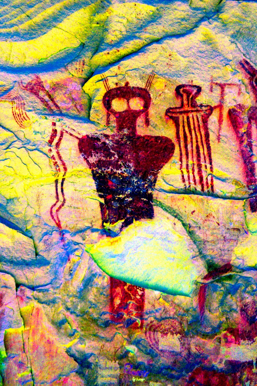 These figures have been etched on top of and below some rather faded BCS pictographs that are difficult to see, particularly in full sunlight. They pop out rather nicely when run through the DStretch filters, however.