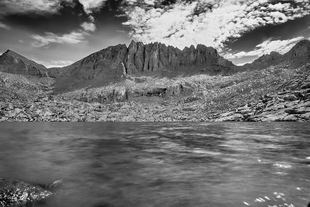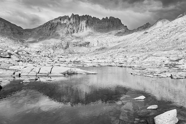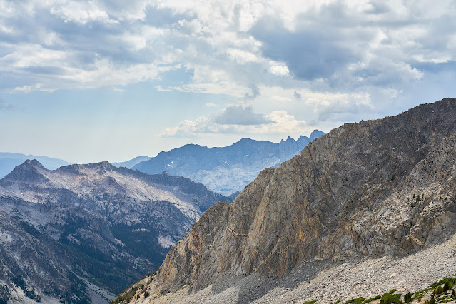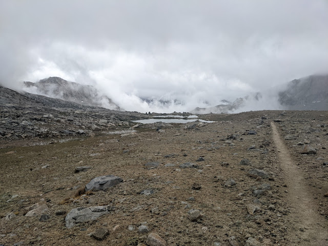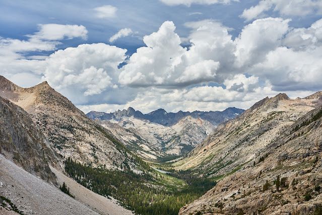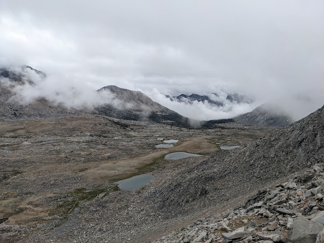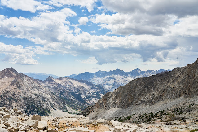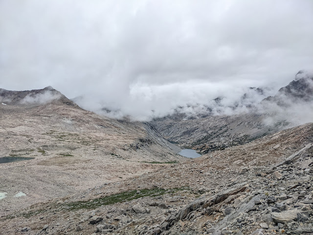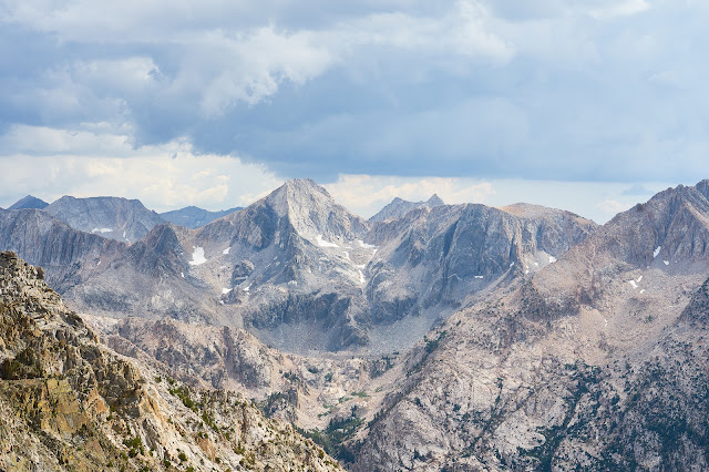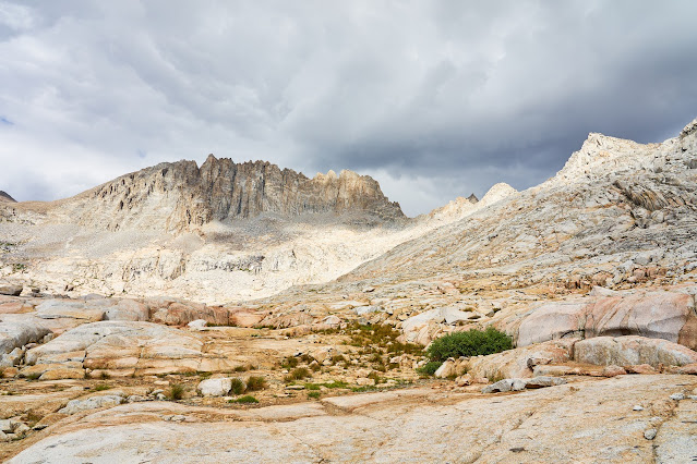 Looking down at Dusy Basin from Knapsack Pass, lots of dark clouds. I put my camera away and hurried down the scree covered slope. I had read some trip reports online, but clearly had mixed something up because I aimed for the upper part of the basin which took me through tons of talus, most was stable but there was enough loose stuff to make it "interesting". From reading online, I should have aimed for the lower basin and a user trail.