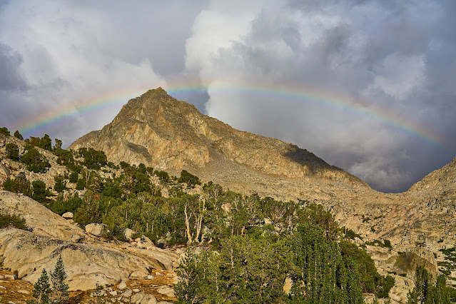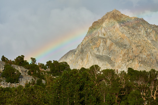 After a couple hours of very heavy rain, it finally stopped. I found four tents set up really close to me. The occupants came out and apologized for setting up so close, but the lightning made them scramble to get off the trail. We chatted a bit while cooking dinners and watched the sky. They were hoping to make it over Bishop Pass in a couple of days, but the rain had slowed them down. After a bit, the rain came back with a vengeance and we all dived into our tents for the night.