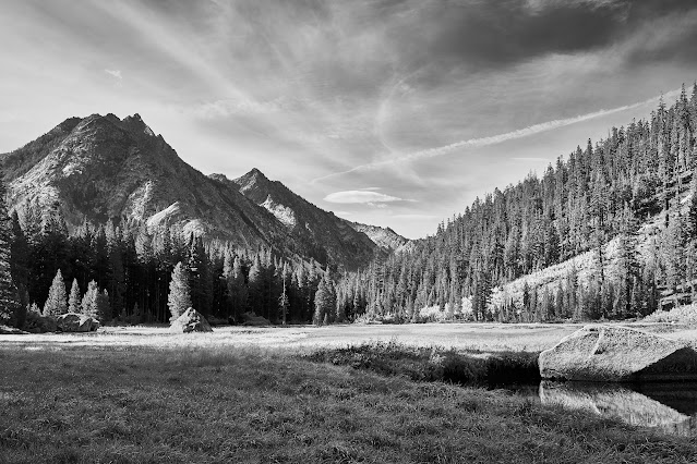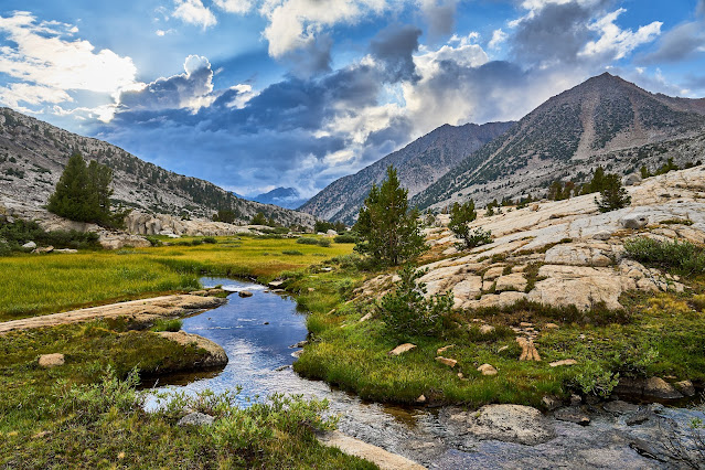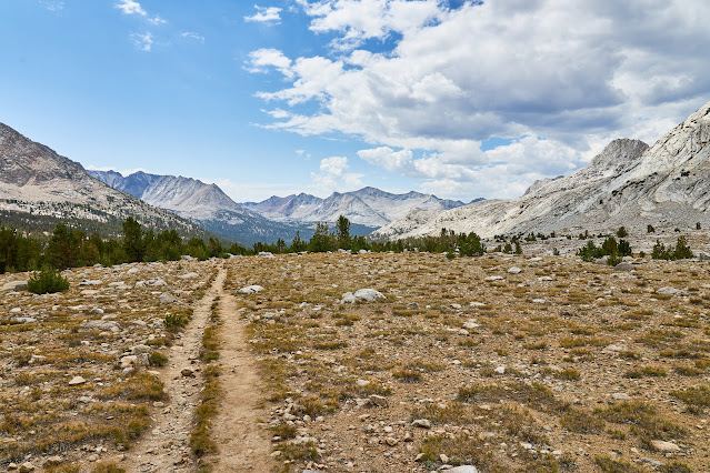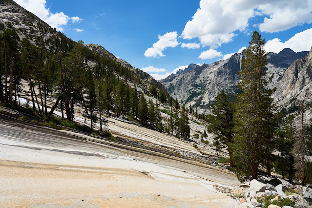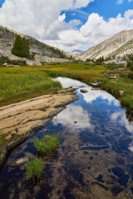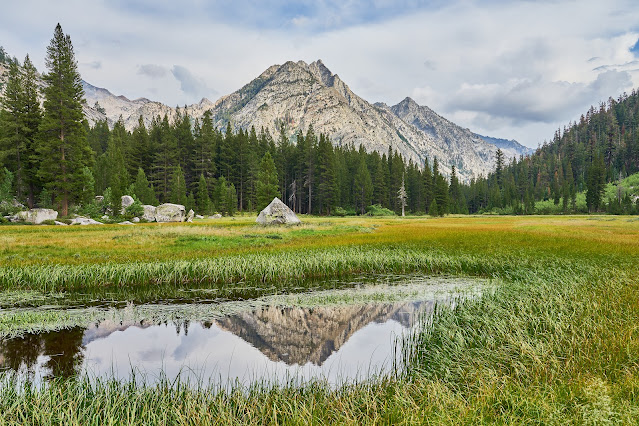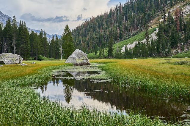 I got down to the JMT and wandered over to the ranger station to see if there was any news about washed out roads. The ranger said she had not heard anything about Taboose, so I left hopeful that I'd be able to get my car out. I headed south on the JMT and considered making the climb to Ladder Lake. I'd decided that it didn't make sense to make a 2000' climb just to hang out in my tent, so I kept moving until I came to a great campsite on the edge of Grouse Meadow and I decided that would make a good home for the night.
