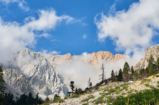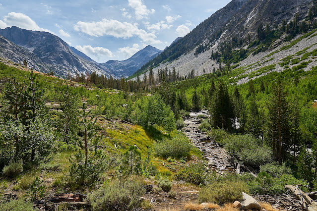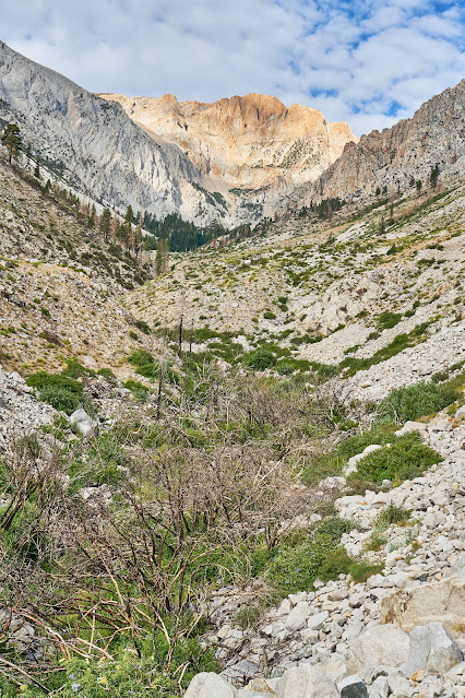 Bluer skies but still clouds building in the morning. Today was going to be short since I was just moving down to Lower Dusy to check things out.
