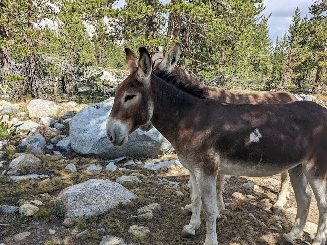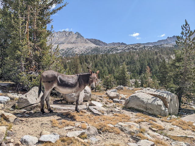 I made my way north by going cross country for a bit, basically paralleling the JMT but on the east side of the river. After about an hour, I eventually rock hopped the river and found the JMT. As I was hiking I started hearing bells. At first I thought I was imagining it, but then I came around a corner and found a bunch of mules, a couple of which had bells on.