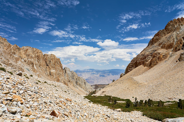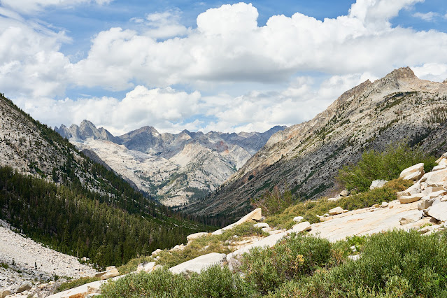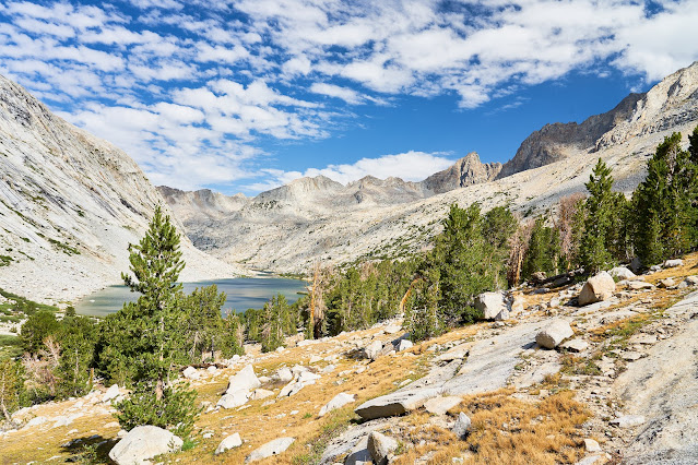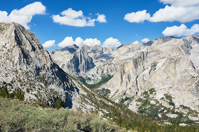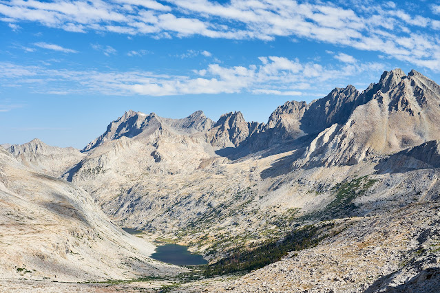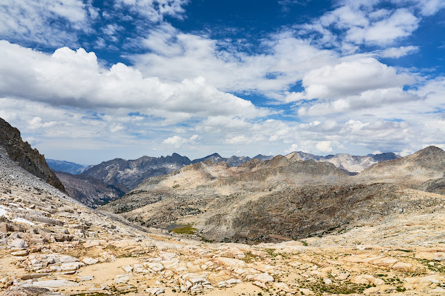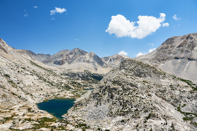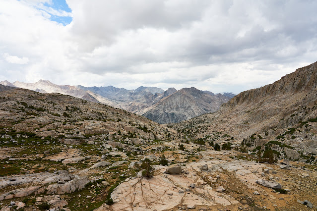Time for some off-trail exploration. Climbing to Cirque Pass and looking down at the lower Palisade Lake and Mather Pass in the distance. I put my camera in my pack after this since there was going to be some scrambling to get to Cirque Pass.