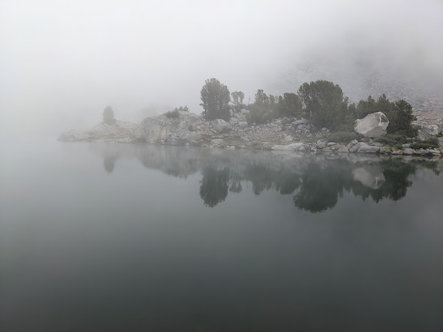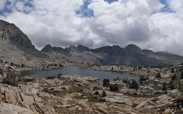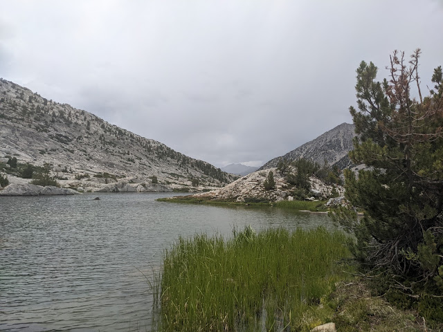 I hurried past the lower Palisade Lake and quickly got set up in between the two lakes and dived in my tent just as the sky opened up, rain, thunder, lightning. The temperature dropped enough that I crawled in my sleeping bag while I read. After a bit, I was hearing voices, but it was still pouring so I did not try to figure out what was going on.