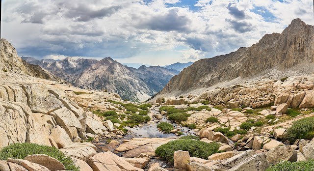 Pano from the Dusy Basin trail looking west, I believe the pointy peak on the right is Mt. Langille with The Black Divide in the background.