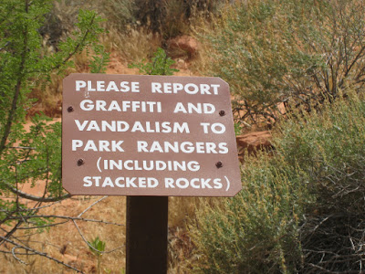 When we were hiking on our recent trip to the Southwest, we noted this very clear sign that made it apparent: stacked rocks are graffiti. This is especially important in the Southwest, where geoglyphs and other rock installations can be thousands of years old, and indicate real archeological importance. Scrawling all over that with your own clever creations is graffiti, nothing more or less.