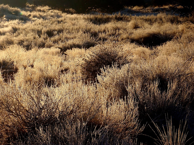 Soon the eastern sky fills with light and we make haste across the desert, alternating sandstone, sandy hills, and frost covered vegetation. We stop at Sunrise Rock (I have a few places that go by this name) and marvel at the total lack of the signs of the workings of man—that and the silence minus the low whistle of a little wind.