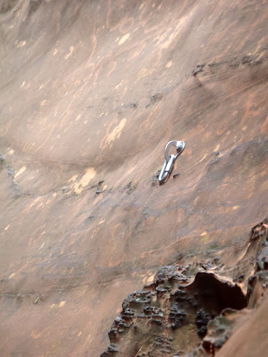 The squeeze past the log is awkward. Aaron simply stems over the top and helps with packs. A rap off a log jam appears to offer a route down and past the difficulties. A brand new bolt is spied up there, several yards upcanyon. All shiny and new, it can’t be but a few months old. But it is an alluring trap. A devious lie. It leads a prospective rapper down between two even newer log jams and into a dead end and a trap which to climb out of would be very difficult. The irony does not escape us. A fixed anchor, a fixed solution in a very dynamic environment. Someone needs to remove this ‘temptress’ before someone gets into trouble.