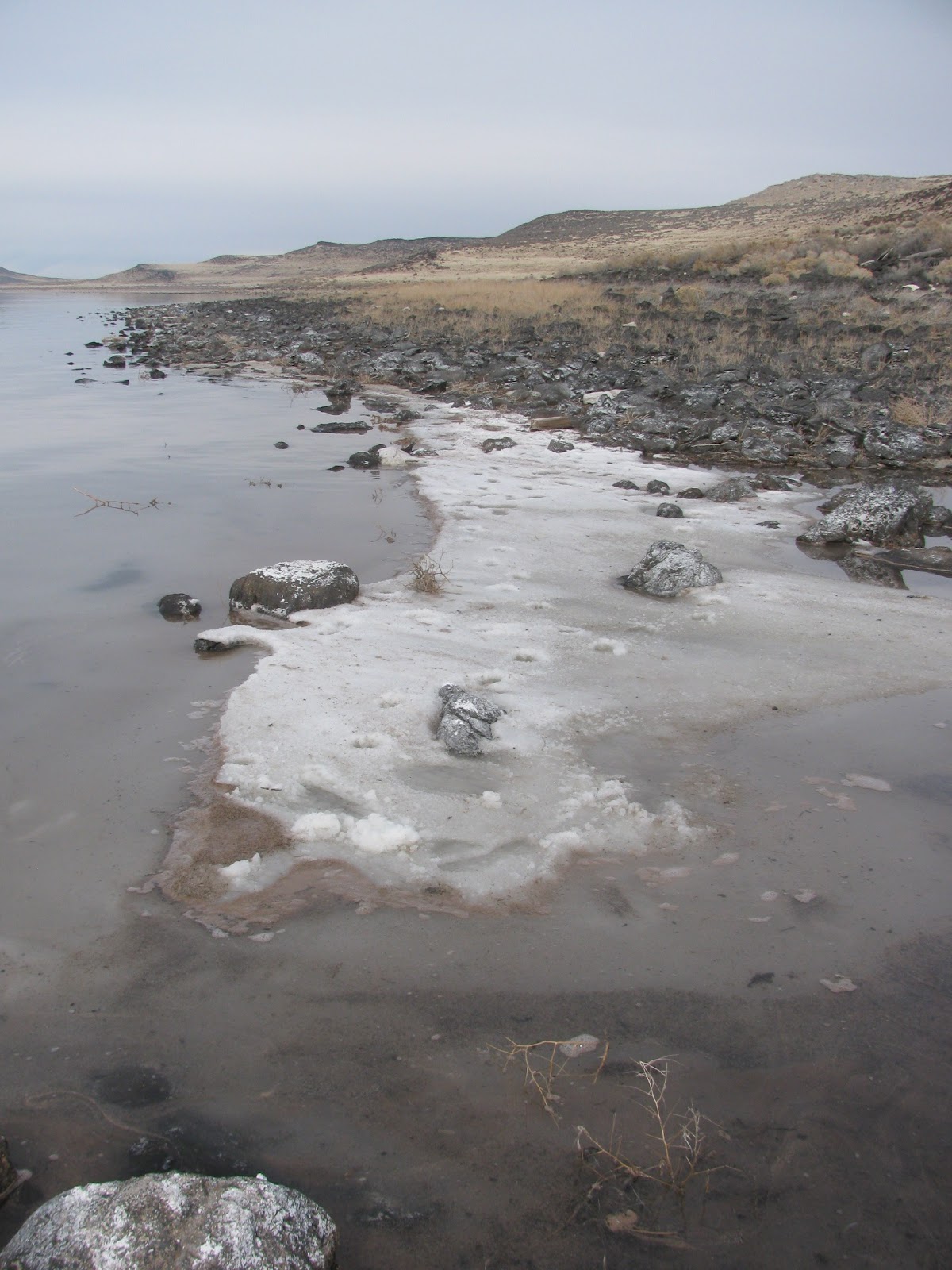 We had the place to ourselves. The lake was high and we could just make out the shape of the Spiral Jetty under the surface. A few rocks on the stem were poking out. I wanted to walk out there, but then I reminded myself that it was February and the water would be freezing cold.